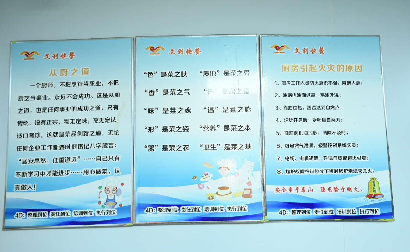 文利快餐执行的是4D厨房管理标准体系,操作间整洁明亮,地面干净卫生,炒菜、凉菜、面点等岗位区域分工明确,锅铲等厨具摆放整齐,干净地摆放在指定标识好的专属位置上,每一个物品都有它的“主人”,专人专管,菜品贴上醒目标签分类存放。