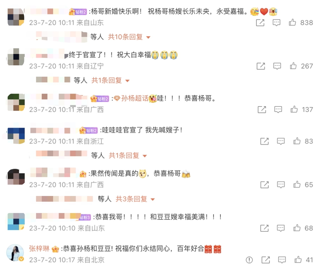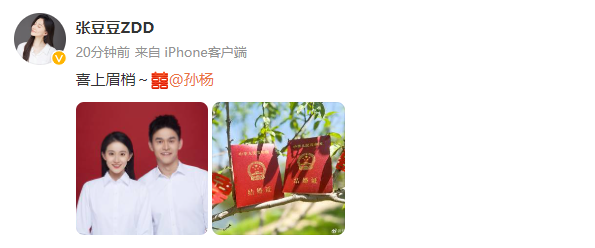 7月20日,游泳运动员孙杨官宣结婚,女方是中国艺术体操队员张豆豆。两人在各自的微博纷纷晒出了结婚照和结婚证,配以文案“抬头见喜”“喜上眉梢”,正式对外官宣了好消息。