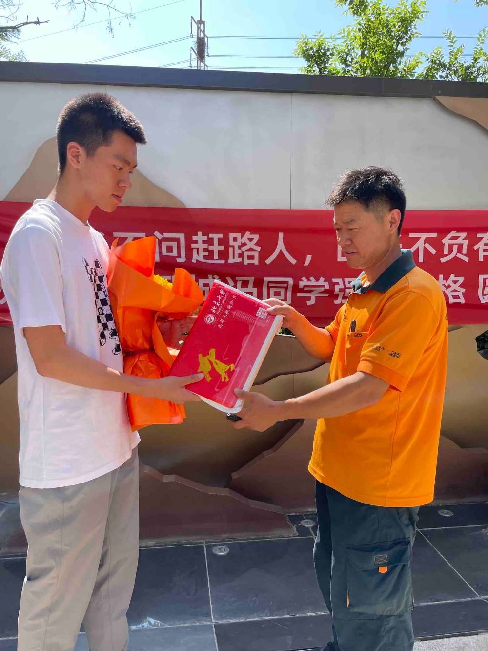“你好,请问是冯青同吗?我是青岛邮政的工作人员,你有一份录取通知书,请准备好身份证,我们15分钟后过去。”在青岛邮政水清沟揽投部,工作人员小心地拆开了一个写有“北大高录”字样的快递袋,拿出录取通知书,带上一束鲜花,以最快的速度来到投递地址。冯青同和家人早早在小区门口等候,核对完信息,签完字,冯青同小心翼翼接过通知书,绽放出灿烂的笑容。“当查到高考裸分691时,我就知道达到清华、北大的裸分分数线了,而考上北大是我一直以来的梦想,如今实现了!”