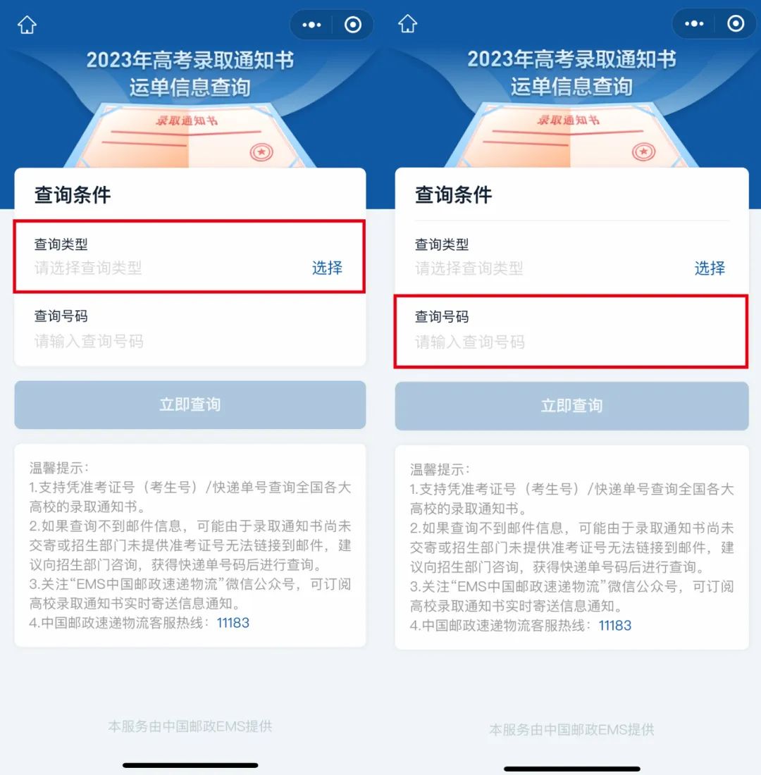 选择查询类型(准考证号或快递单号),