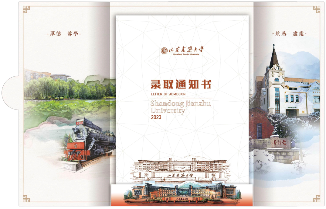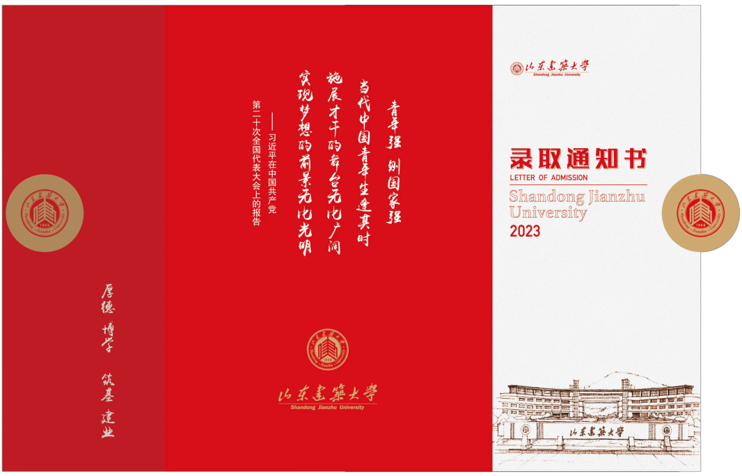 通知书外封面以传统的建大红为主色调,内容由“学校校徽”“录取通知书”字样“校门手绘图案”及“建大校训”“主席语录”五部分组成。“学校校徽”“录取通知书”字样均采用建大红色彩设计,校门图案采用手绘设计,同时也是建大标志性建筑之一。