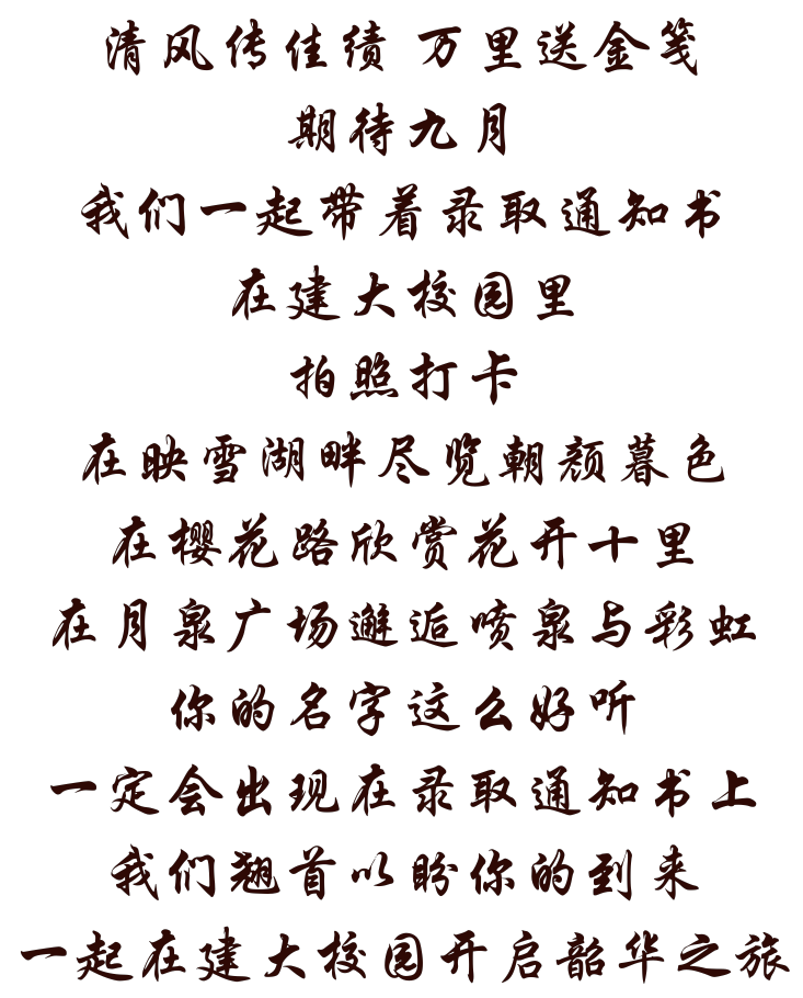 翻开封面,首先映入眼帘的是校训“厚德博学,筑基建业”。“厚德博学”就是“筑基”,有了“厚德博学”,才能“建业”。此条校训是对广大建大学子为学、为人、立世、创业的鞭策和激励。四者各有侧重,相互交融,浑然一体,共同构成了校训的基本内容,寄予期盼与嘱托,润物无声于每一位建大学子。