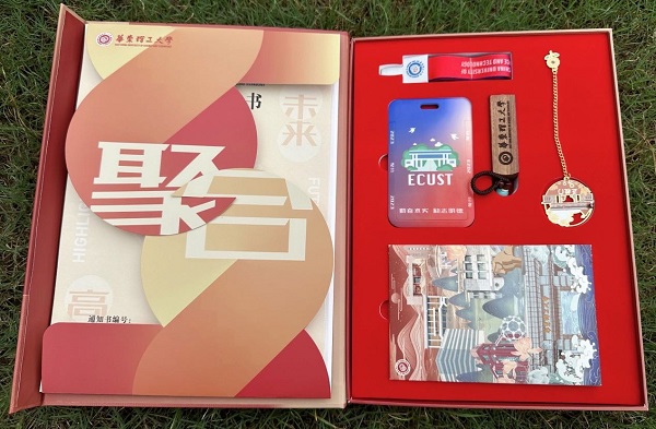 据介绍,华理2023年录取通知书以“聚合”为主题,用分子的聚合象征华理以化工、化学、材料等为特色优势学科,也体现出华理文理交融、多学科协调发展的办学特色,殷切期待每一位新生成为华理大家庭的一“分”子。通知书放置于礼盒里,礼盒内部还装有华理师生设计的文创周边,包括金属书签、卡套、檀木印章等。手绘华理建筑明信片使校园于朵朵浪花中巍峨而立,寓意学子在华理乘风破浪、扬帆起航。