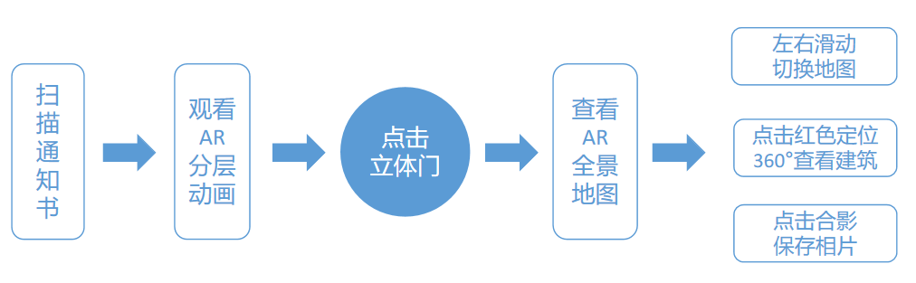 AR版通知书设计在功能上如图所示 : 先扫 描纸质版通知书 ,得到AR分层动画,用户通过点击中心的立体门,进入 AR全景立体地图 页面,左右滑动即可切换金家岭校区和浮山校区全景地图,点击地图上的红色定位图标即可360°查看建筑及其文字介绍,点击合影按钮,即可 和AR虚拟元素合影 ,定格美好瞬间。