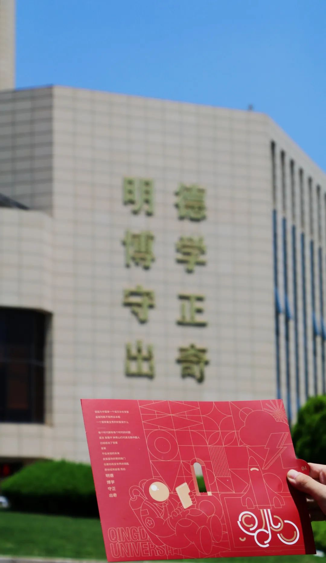 以青岛大学正门与英文字母为主体