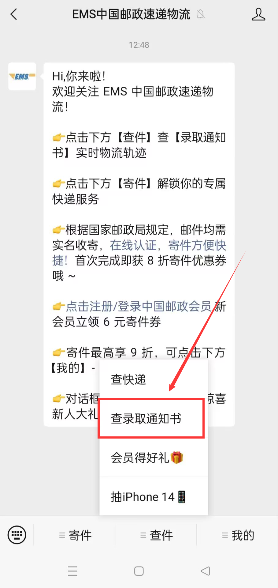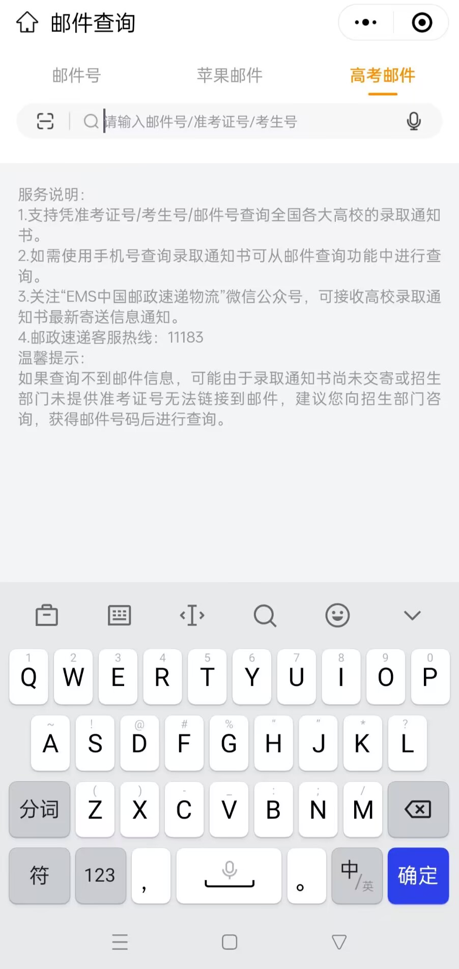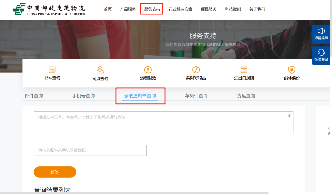 1.在 “中国邮政速递物流” 官网( http://www.ems.com.cn/ )的菜单中查询信息找到 “服务支持” —— “邮件查询” ,点击进入查询页面,找到 “录取通知书查询” ,根据提示进行查询。