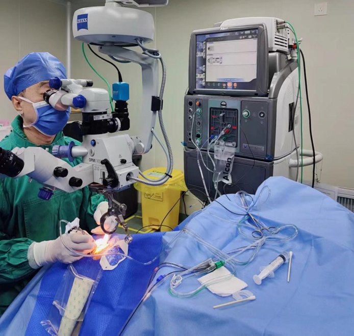 好在经过术前的精心准备,赵大叔的手术于第二天上午顺利开展。术中可见右眼脉络膜大面积萎缩,视网膜脱离,右眼仅剩手动20cm的视力。历时四十分钟,手术顺利结束,成功将视网膜复位。