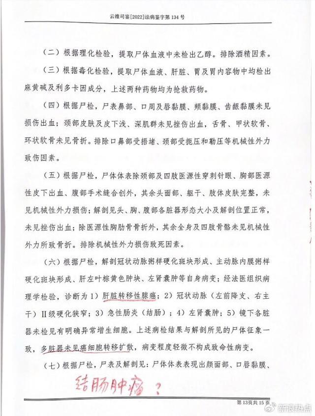云南维权司法鉴定中心进行了尸检,诊断为肝脏转移性腺癌,急性肠炎(结肠)等,并未见直肠癌。尸检注明,病检结果与解剖所见的尸体征象一致、相互印证,多脏器未见癌细胞转移扩散,病变程度轻微不构成致命性病变,符合失血性休克死亡的法医病理学特征。
