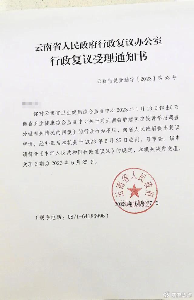 因对云南省卫生健康综合监督中心2023年1月13日作出的行政行为不服,王卫东的家属向云南省人民政府行政复议办公室提起了行政复议。6月27日,该机关出具的通知书显示,该机关已决定受理。
