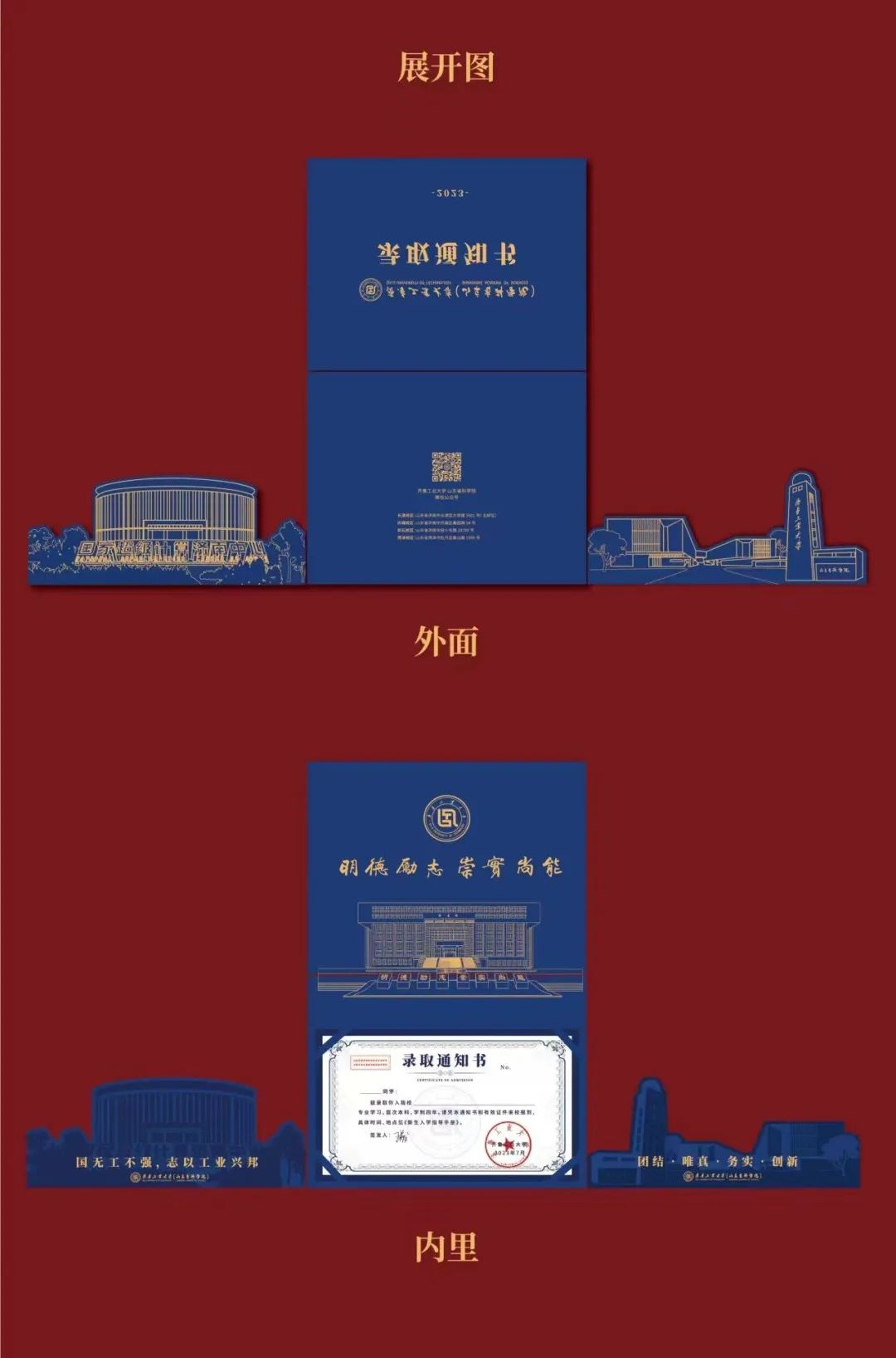 下方,学校标志性建筑“工大南门”“国重大楼”和“国家超算济南中心”作为横开翻页,背面配字“国无工不强 志以工业兴邦”“团结 唯真 务实 创新”,突出工大浓厚的学术氛围。