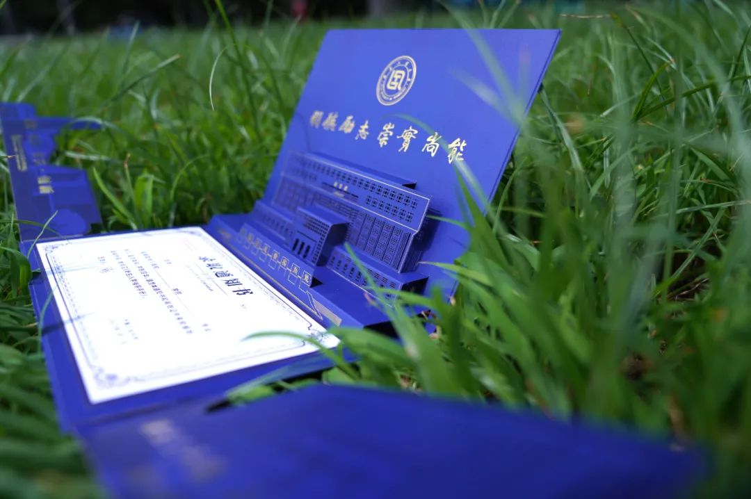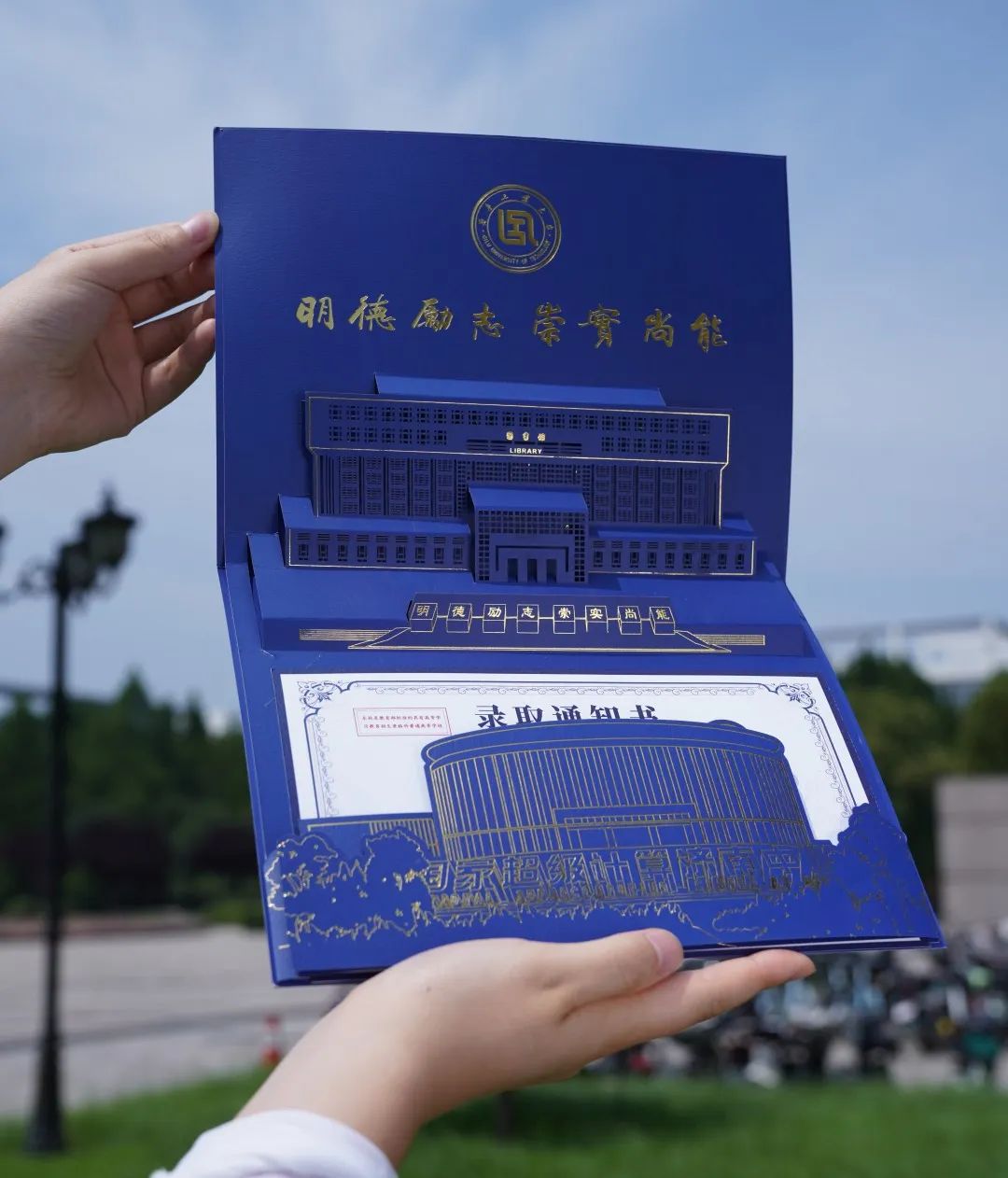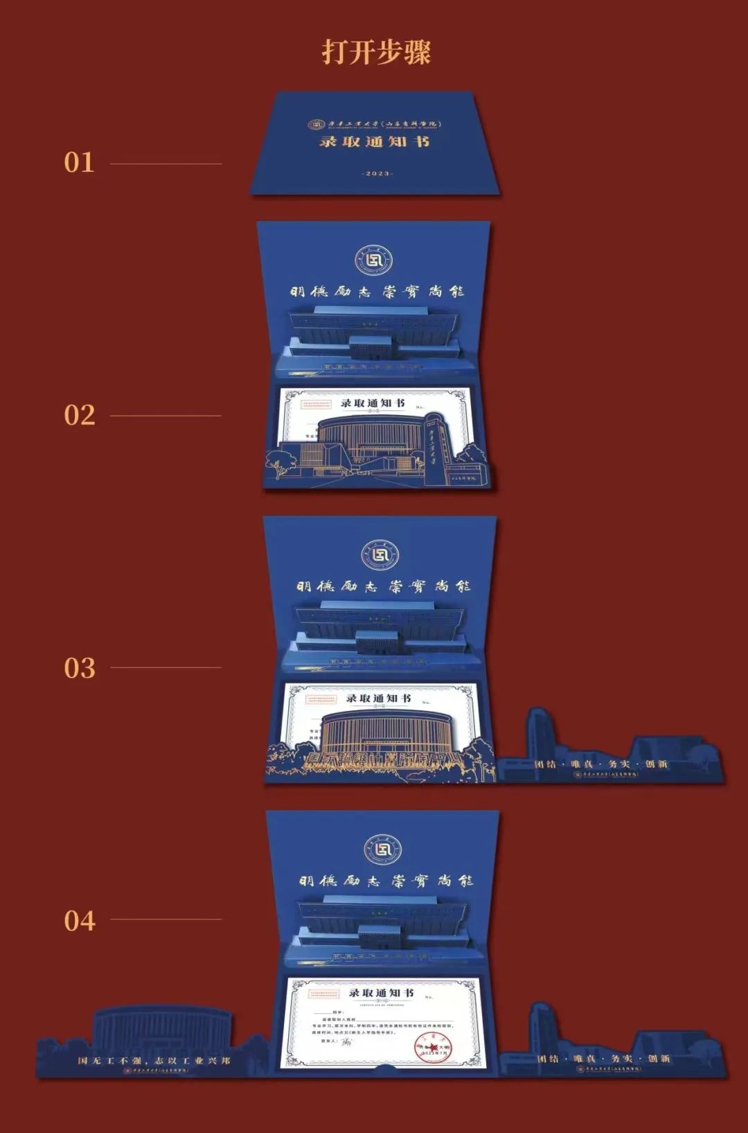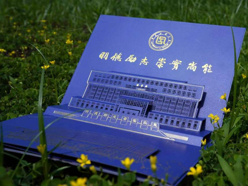 开启录取通知书,工大校训“明德励志 崇实尚能”映入眼帘。校训上方是金色的校徽,下方是立体微雕的图书馆,立体感扑面而来。