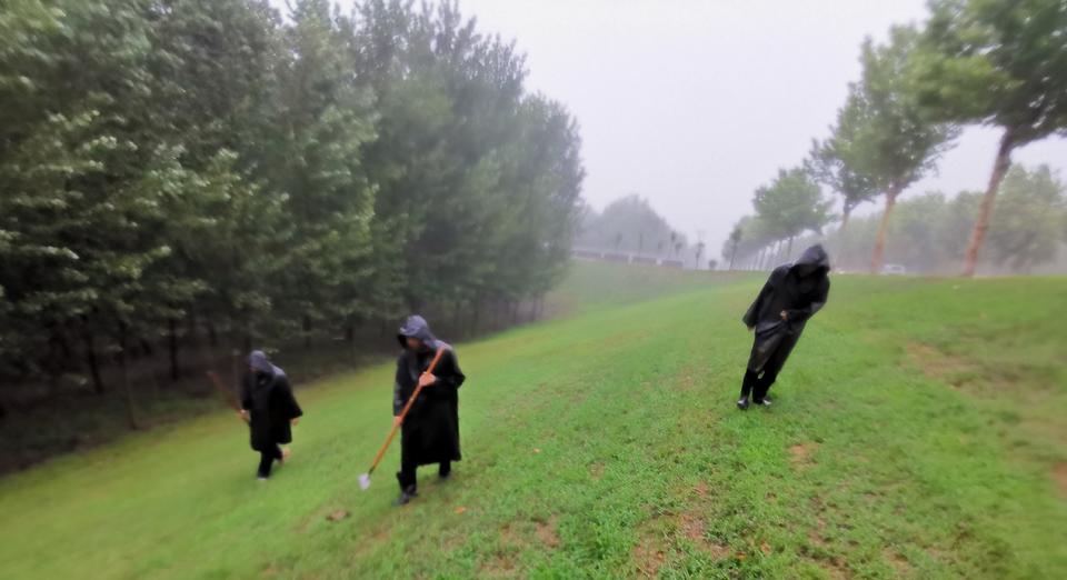 当日下午6时,风更疾,雨未停。在空旷的黄河畔,唯有坚定巡查的脚步伴着涛声依旧的河水,在黄河岸边无畏逆行。风雨抽打着雨衣,发出“啪啪”的响声,闲不住的巡查人员牛善斌等人又在清理堤防积水。