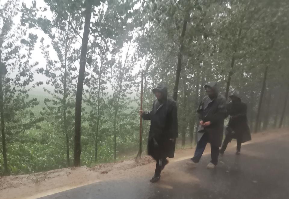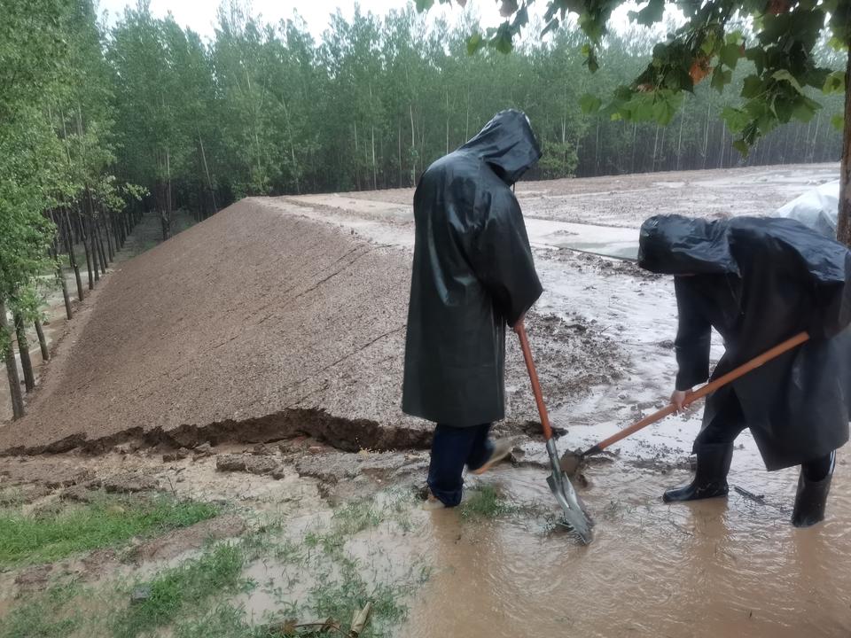 当日下午5时,雨势再次增强,他们巡查的脚步没有停下。在程那里堤防,被雨水浸润透了的堤坡并不是那么好走,湿滑且泥泞,有几次差点摔个趔趄。顶风冒雨急行军的他们,突然再次停下前行的脚步,原来在此处发现了一处雨毁。他们又再一次圈垫、夯实,完成了修复。