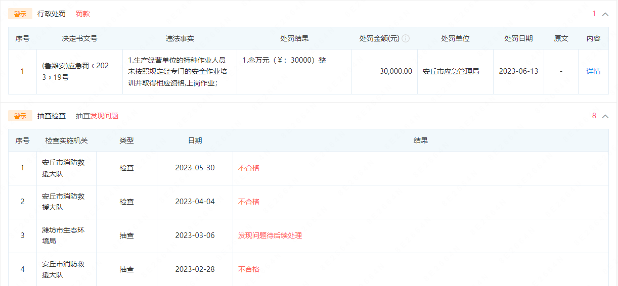 此前,该公司因生产经营单位的特种作业人员未按照规定经专门的安全作业培训并取得相应资格,上岗作业,被安丘市应急管理局罚款30000元。在近期相关部门的抽查检查中,该企业基本为不合格状态。