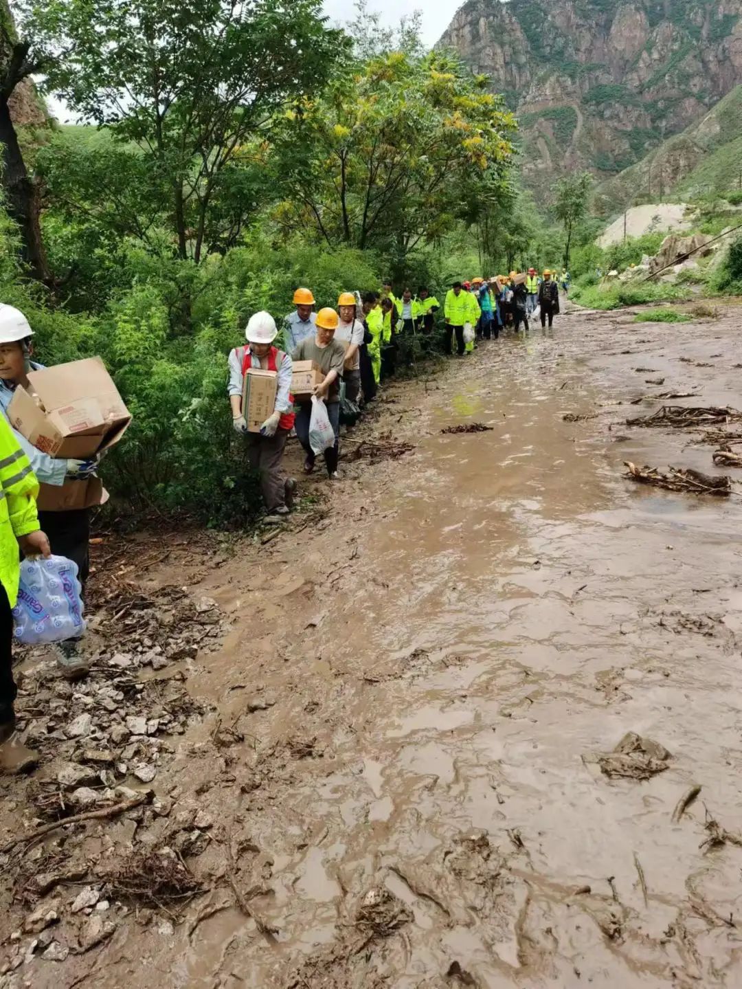 “还有8公里才能到沿河城站,前方路况复杂、列车无法继续前进。没有路,我们就蹚出一条路,背着物资走进去!”8月1日7时左右,195名运送物资突击队人员以肩扛手提、徒步搬运的方式,分批将生活物资往沿河城站运送。