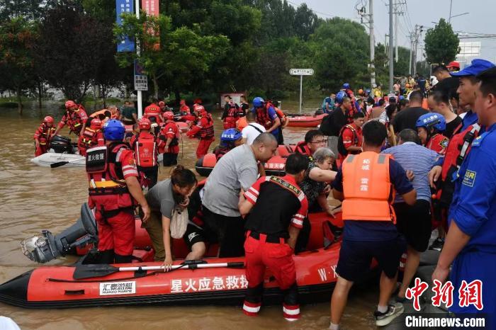 受上游洪水过境影响,涿州市河道行洪和城市内涝风险加剧,防汛形势严峻。腾飞大街数公里长的道路上,一艘艘来自全国各地的各式冲锋舟,在水面上往返救援。
