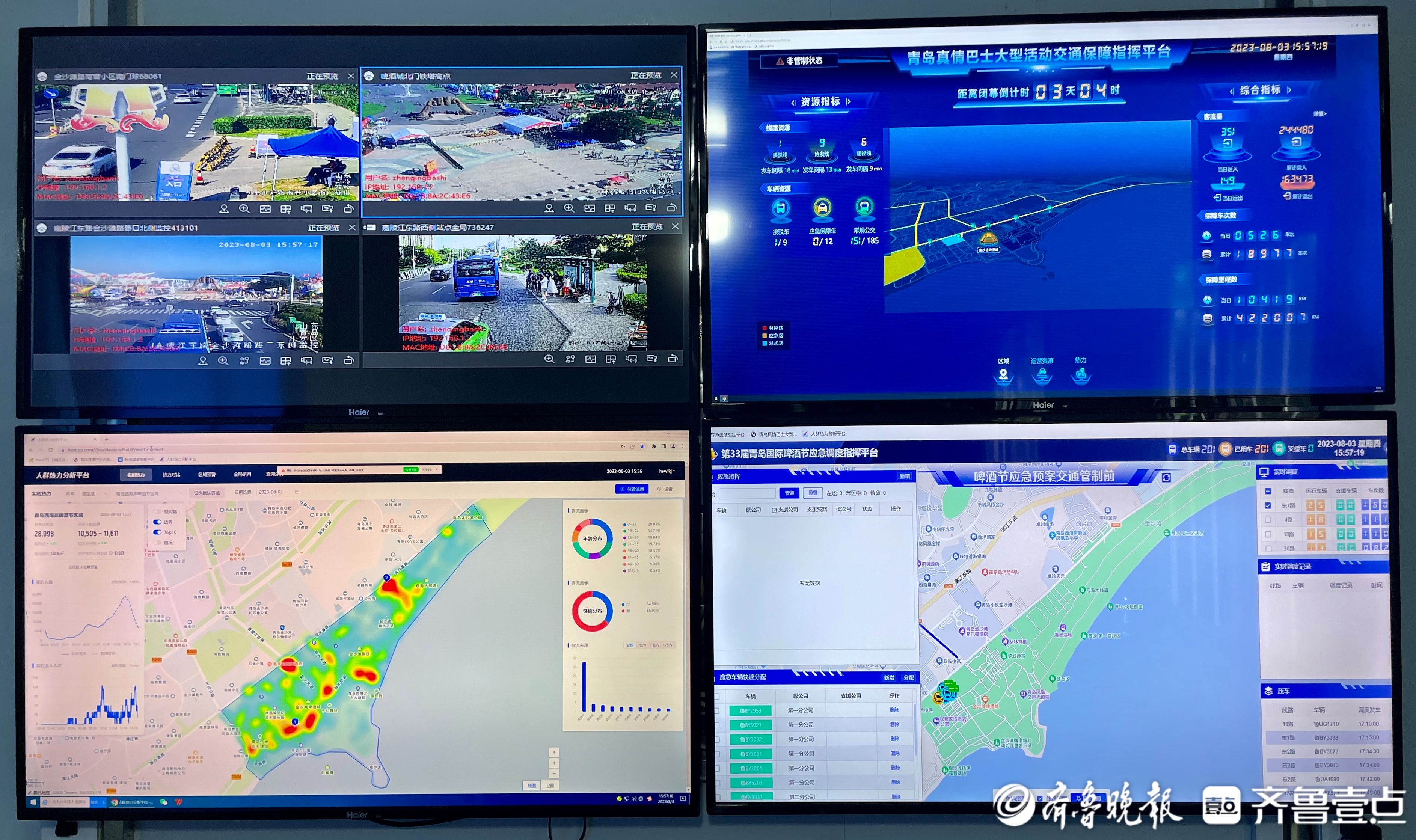 8月2日21点,啤酒城出城游客进入高峰时段。走进金沙滩啤酒城交通保障指挥中心内,记者看到真情巴士大型活动交通保障指挥平台四块大屏幕正在实时更新数据,啤酒城内及周边人员聚集、车辆所在位置、道路拥堵等情况清晰可见。一旁,真情巴士集团一名调度员正在根据平台数据监测多条公交线路的发车密度。