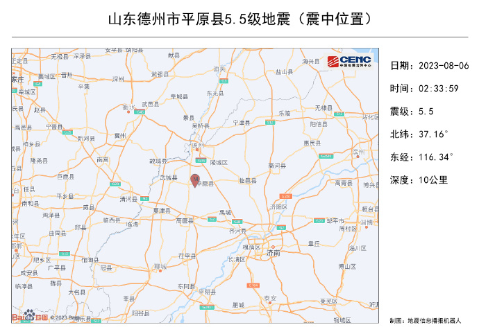 中国地震台网正式测定:8月6日2时33分在山东德州市平原县(北纬37.16度,东经116.34度)发生5.5级地震,震源深度10千米。