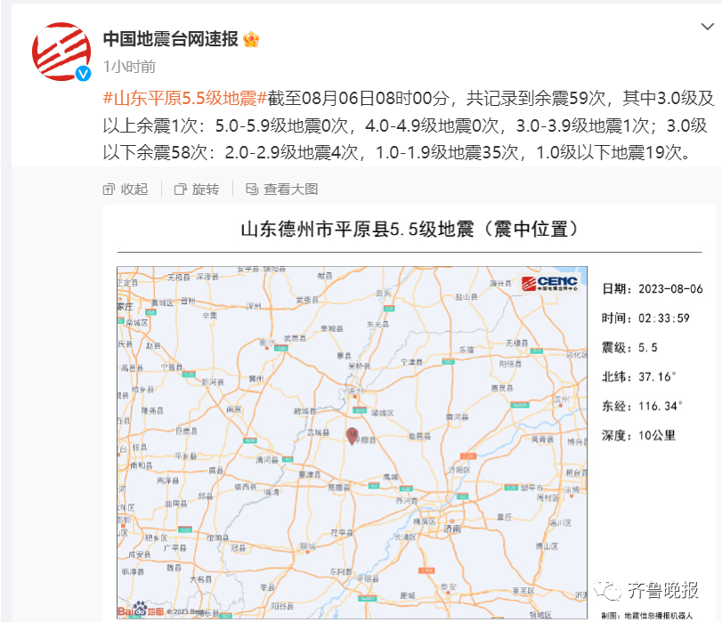 中国地震台网正式测定:8月6日2时33分在山东德州市平原县(北纬37.16度,东经116.34度)发生5.5级地震,震源深度10千米。