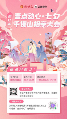 此外,为了更好地帮助单身男女寻找另一半,随时随地在线觅良缘,齐鲁壹报·齐鲁壹点七夕线上相亲大会同步启动,下载齐鲁晚报官方客户端齐鲁壹点,关注相亲频道,或者扫码进入齐鲁晚报·齐鲁壹点婚恋交友官方小程序“壹点动心”,不限时间、不限地点,随时随地点一点,轻松邂逅另一半助您脱单一臂之力!