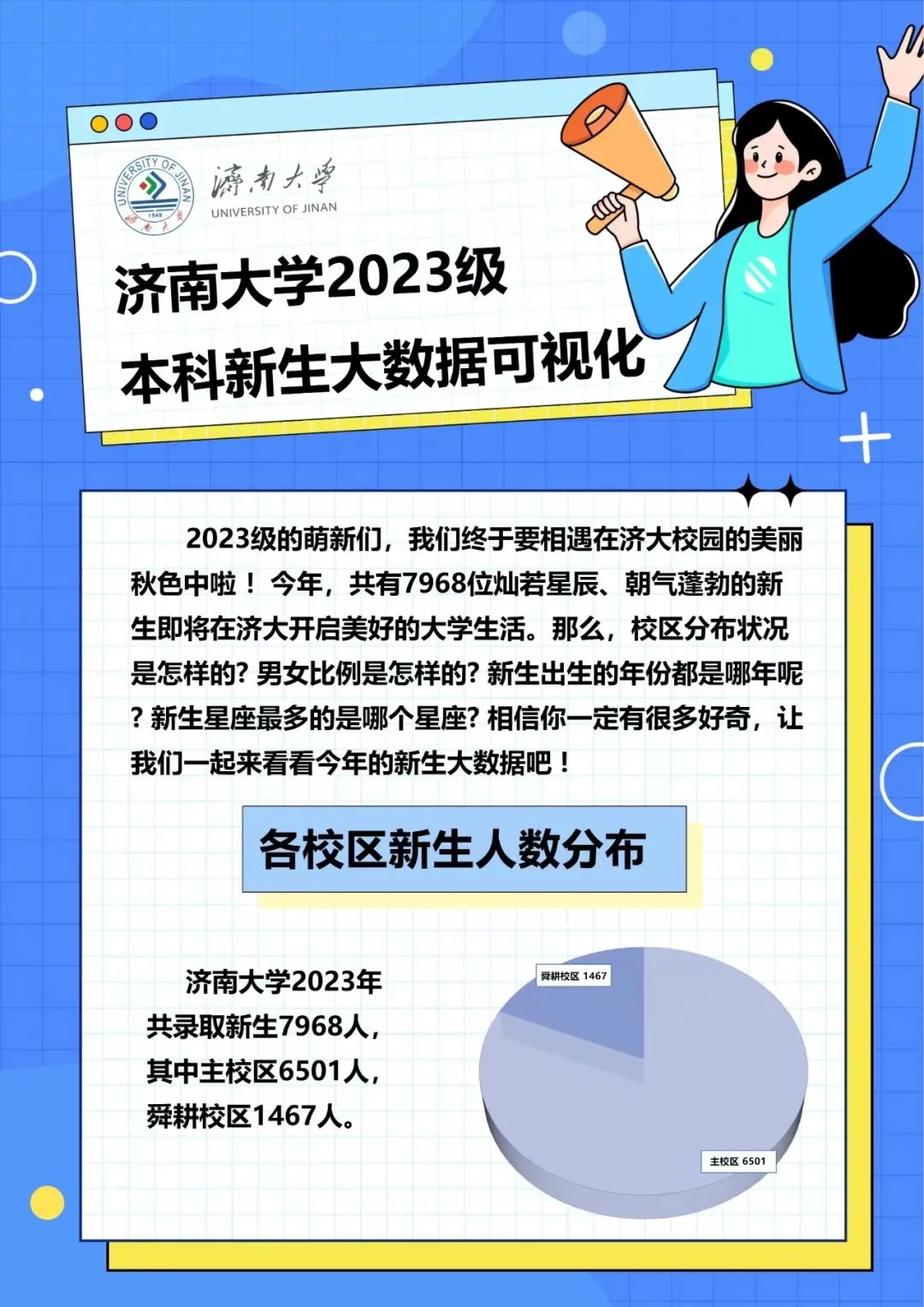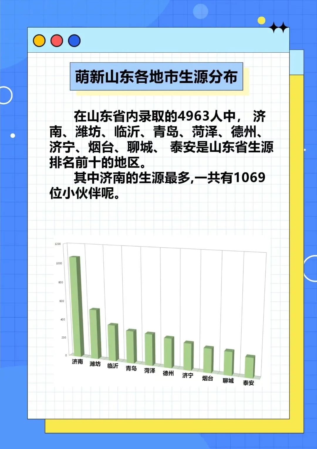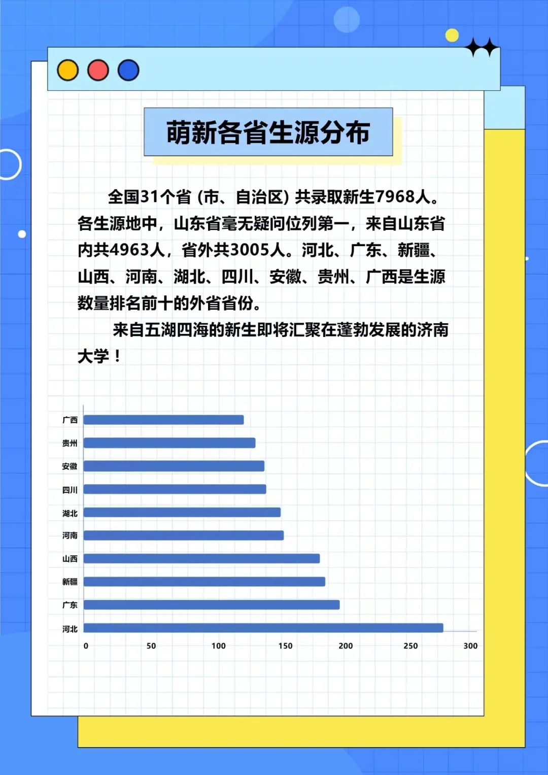 最小萌新仅15岁!济南大学2023本科新生大数据来了! 大众报业·齐鲁壹点 2023-08-11 7086 8月11日,济南大学发布2023年本科新生大数据。记者注意到,济南大学2023年共录取新生7968人,其中山东省内录了4963人。省内所录取新生中,数量排名前三的高中分别是山东省实验中学、莱芜一中、山师附中。从出生年份来看,2005年出生的萌新成为济南大学本届新生主力军,年龄最小的新生仅15岁。 详情一起来看大数据: (来源:济南大学) 责任编辑:徐玉芹