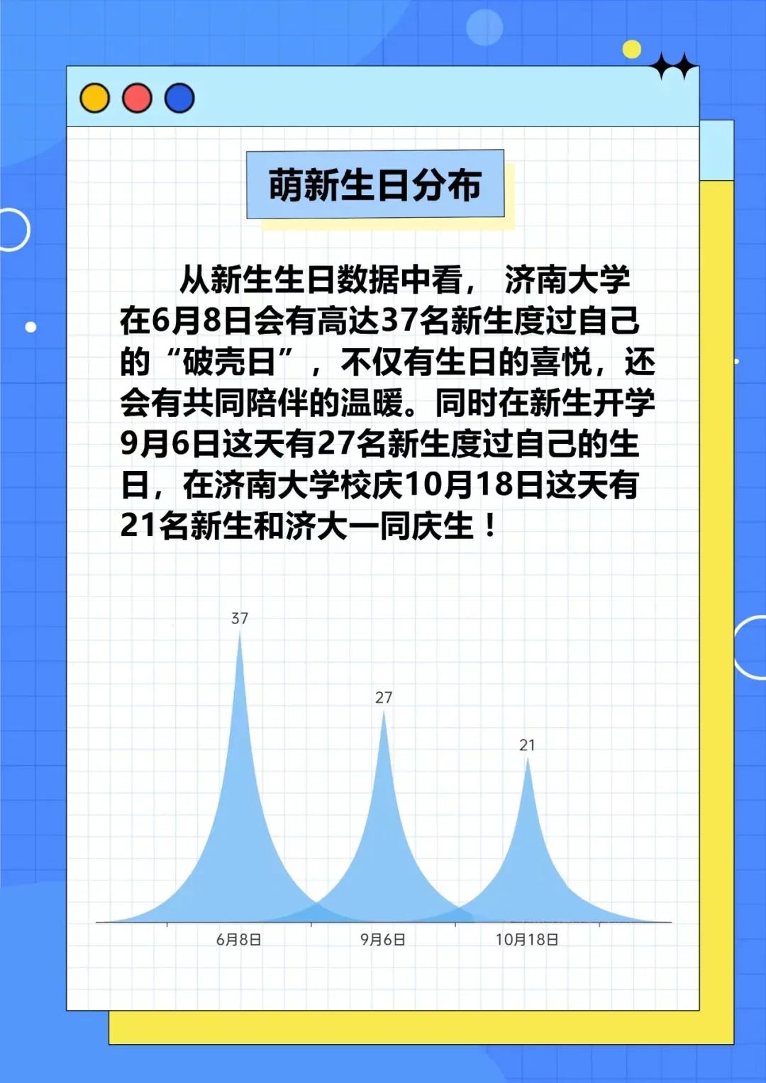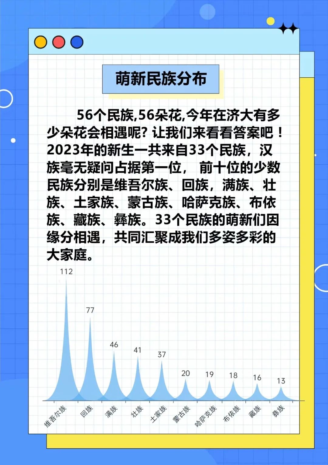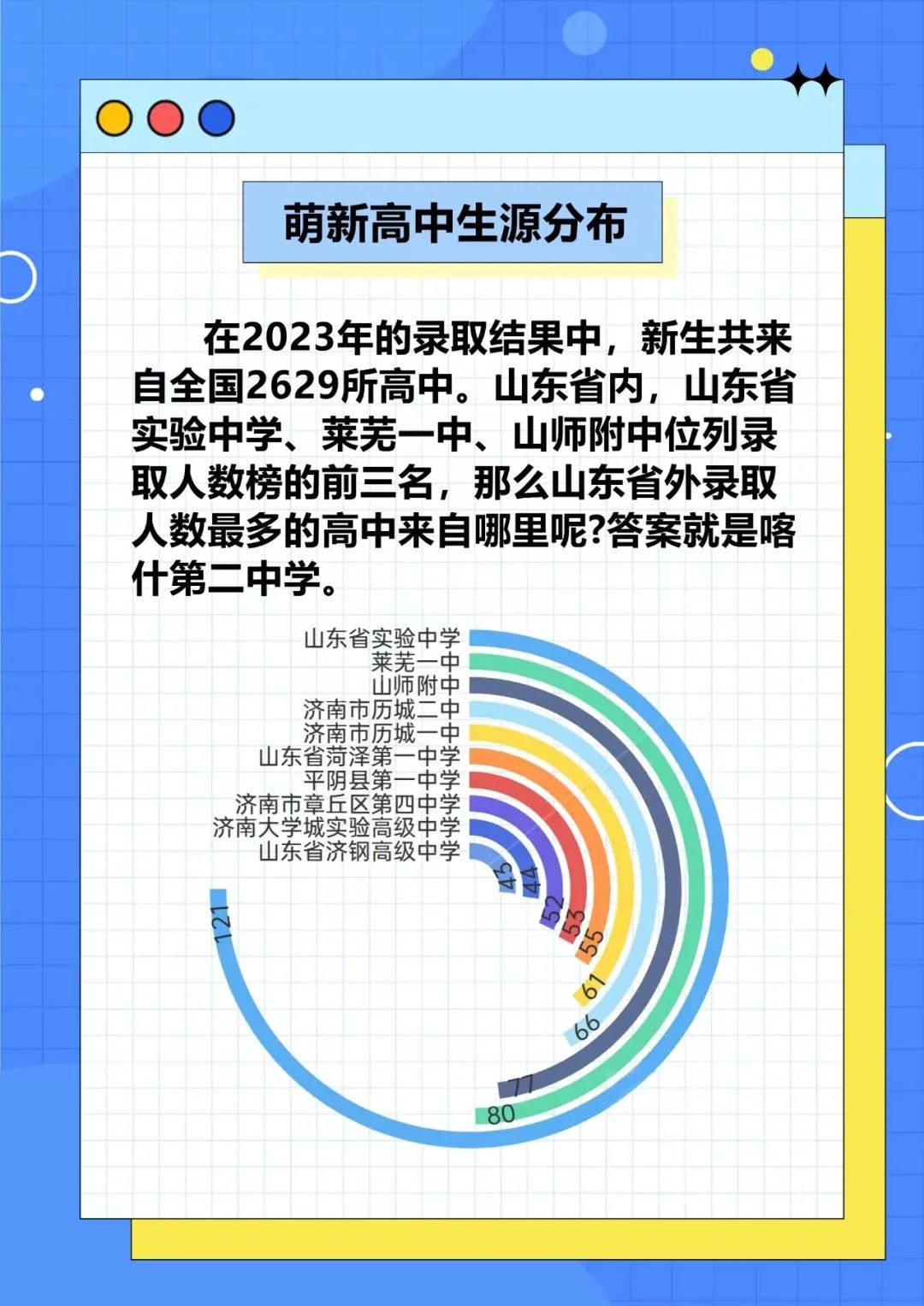 最小萌新仅15岁!济南大学2023本科新生大数据来了! 大众报业·齐鲁壹点 2023-08-11 7086 8月11日,济南大学发布2023年本科新生大数据。记者注意到,济南大学2023年共录取新生7968人,其中山东省内录了4963人。省内所录取新生中,数量排名前三的高中分别是山东省实验中学、莱芜一中、山师附中。从出生年份来看,2005年出生的萌新成为济南大学本届新生主力军,年龄最小的新生仅15岁。 详情一起来看大数据: (来源:济南大学) 责任编辑:徐玉芹