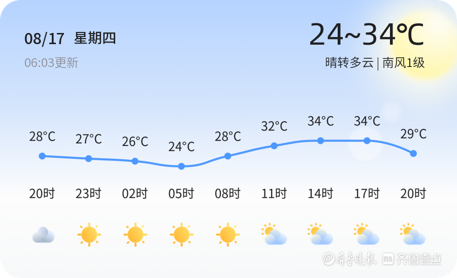 【聊城天气】8月17日,温度24℃~34℃,晴转多云