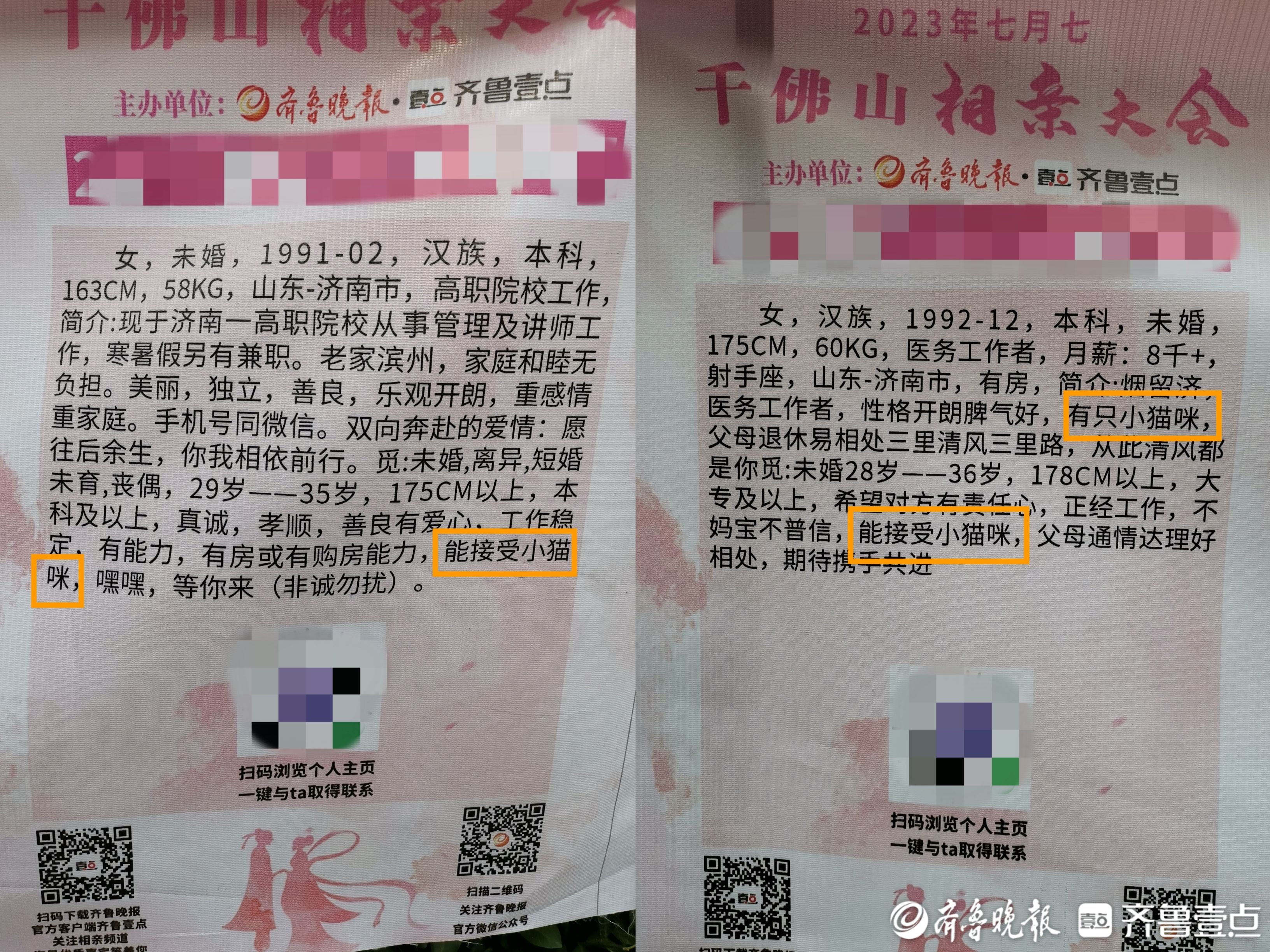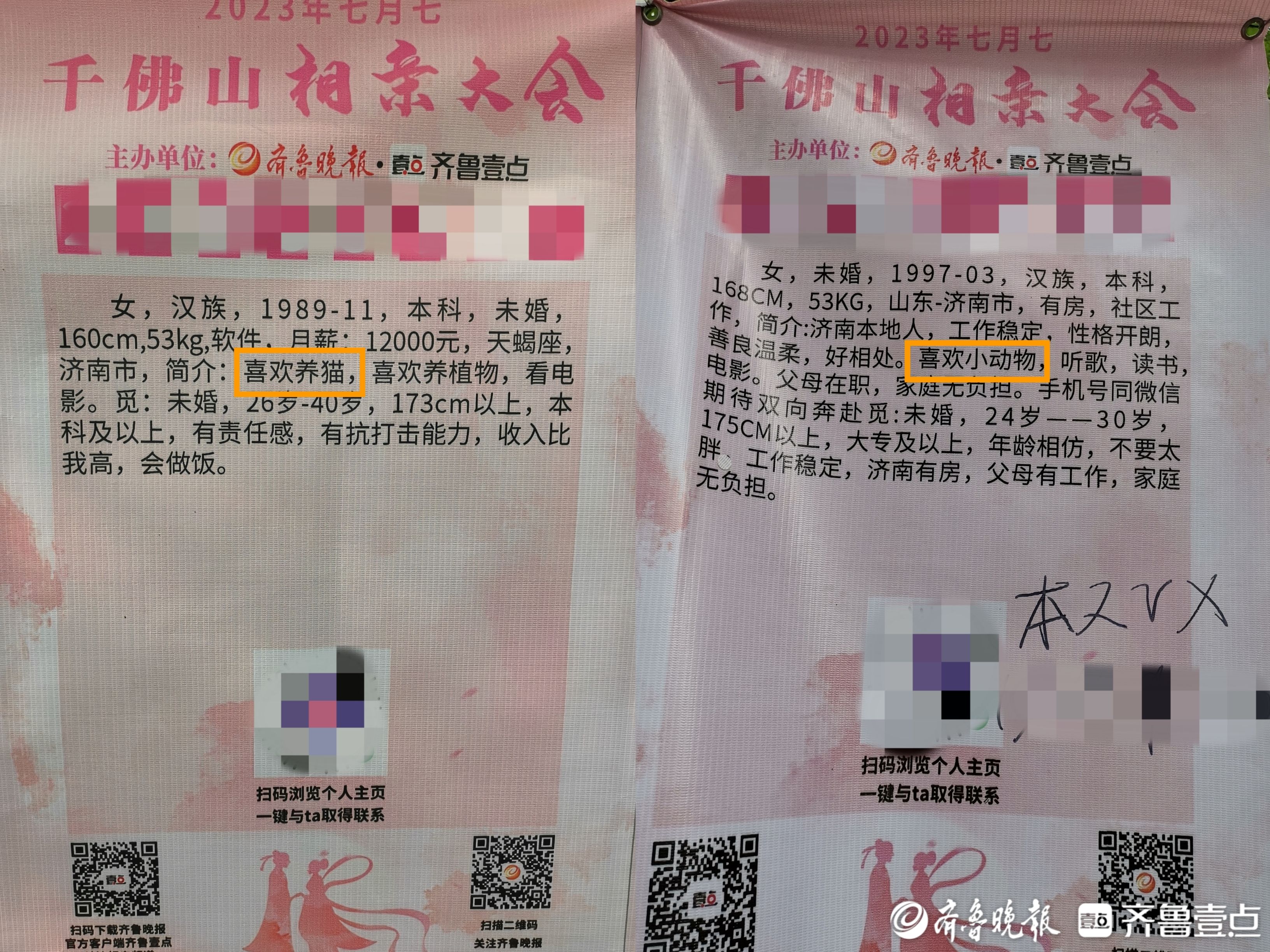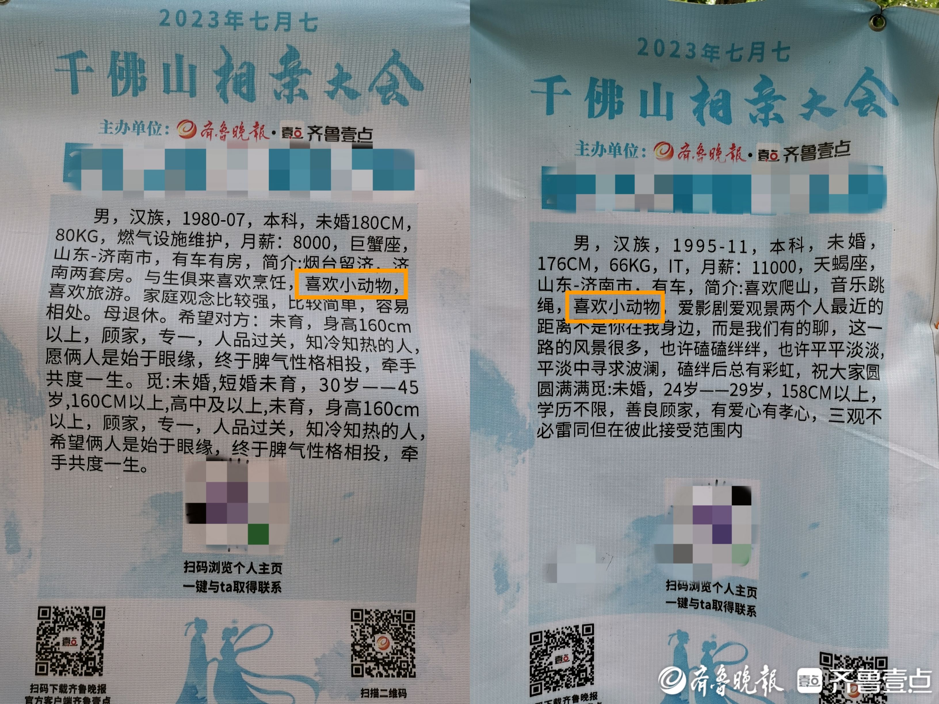 在相亲会现场,写有详细信息的嘉宾信息牌成为了“红线”,牵起了前来寻缘的单身嘉宾。记者注意到,不少单身男女嘉宾都喜欢小动物,喜欢养宠物,还有人把能接受养猫养狗列入择偶条件中。