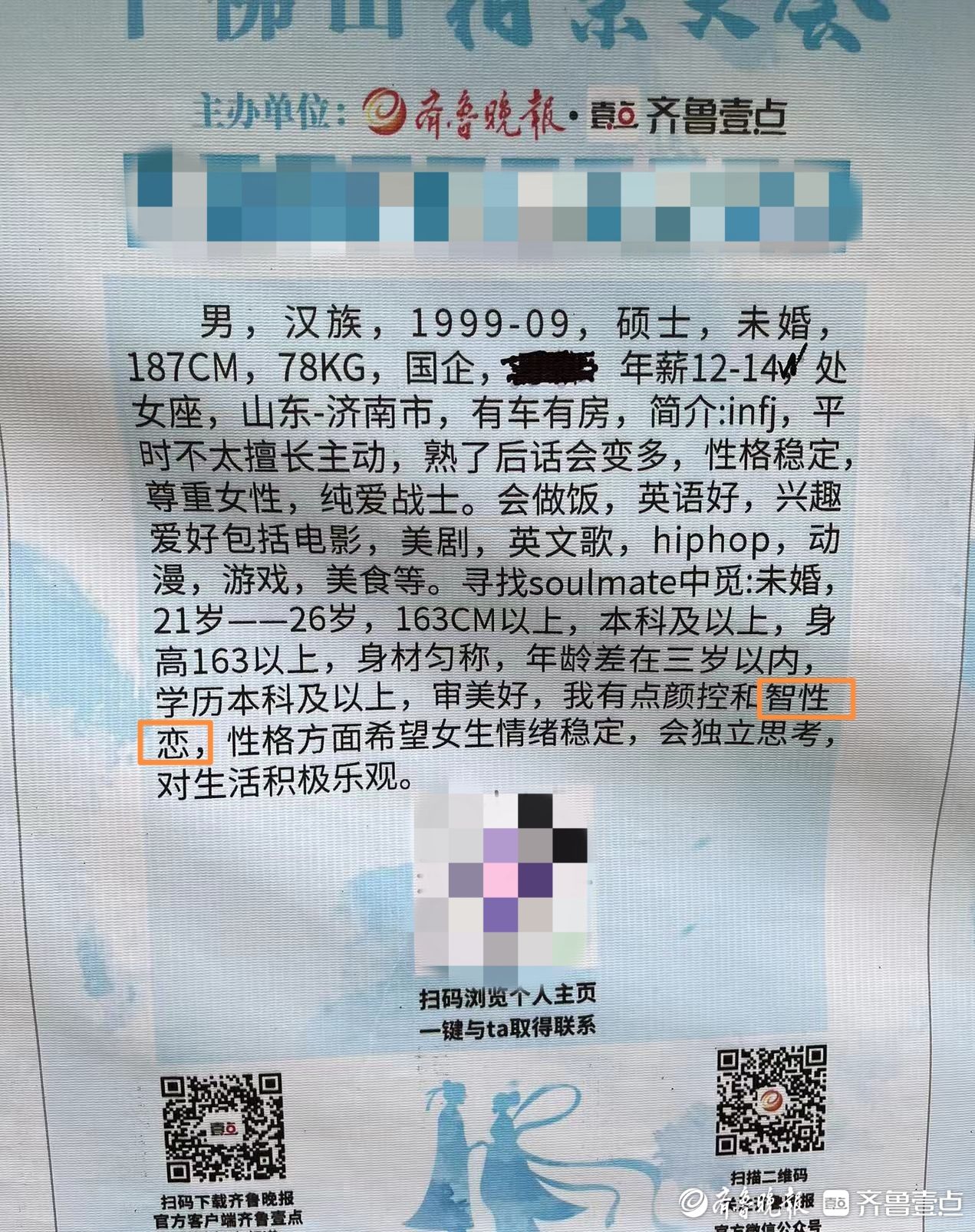 一位99年的男嘉宾在信息牌简介中称自己“有点颜控和智性恋”,希望能找一个年龄差在三岁以内,学历在本科及以上,“审美好,性格方面情绪稳定,会独立思考,对生活积极乐观”的女生。