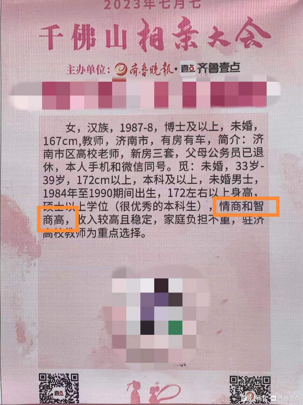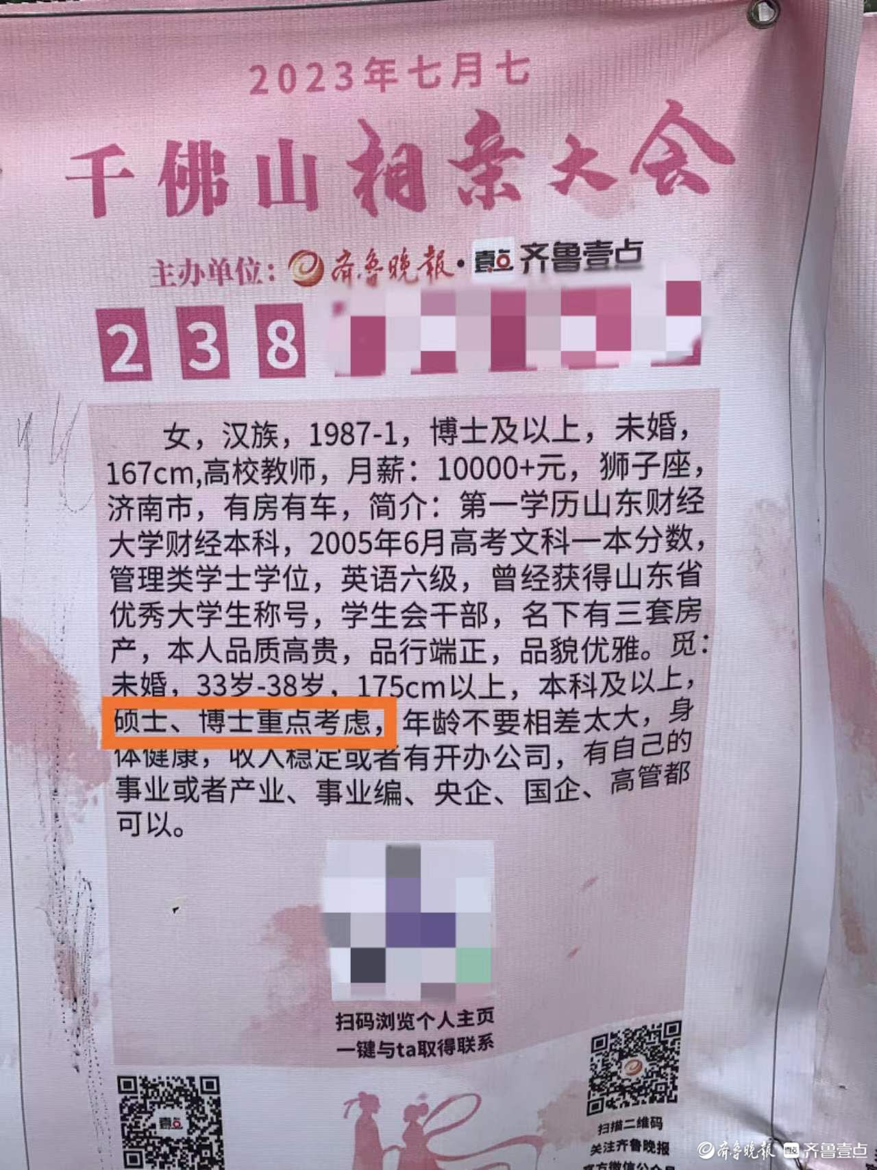 另一位女嘉宾也对未来“另一半”的学历提出了明确的要求:“硕士以上学位(很优秀的本科生),情商和智商高,收入较高且稳定,家庭负担不重,驻济高校教师为重点选择。”