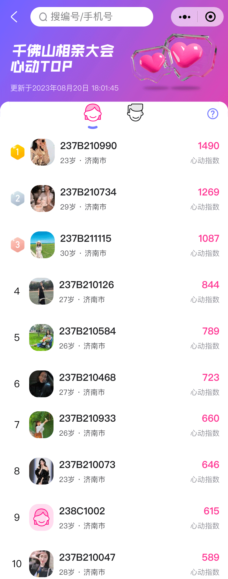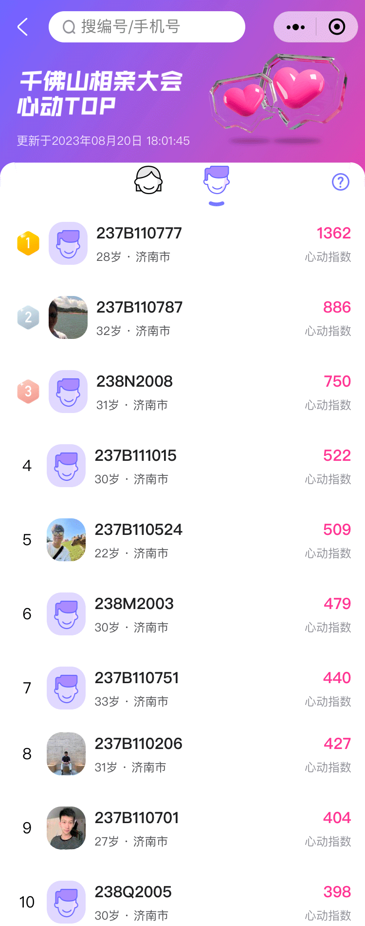 依托齐鲁晚报·齐鲁壹点自主研发的官方婚恋交友小程序“壹点动心”,本届千佛山相亲大会实现服务全面升级,在壹点动心小程序主页设有本届千佛山相亲大会心动榜板块,实时显示现场嘉宾心动排行,截至8月20日下午5点,本届相亲大会第二期人气男女嘉宾浪漫揭晓。