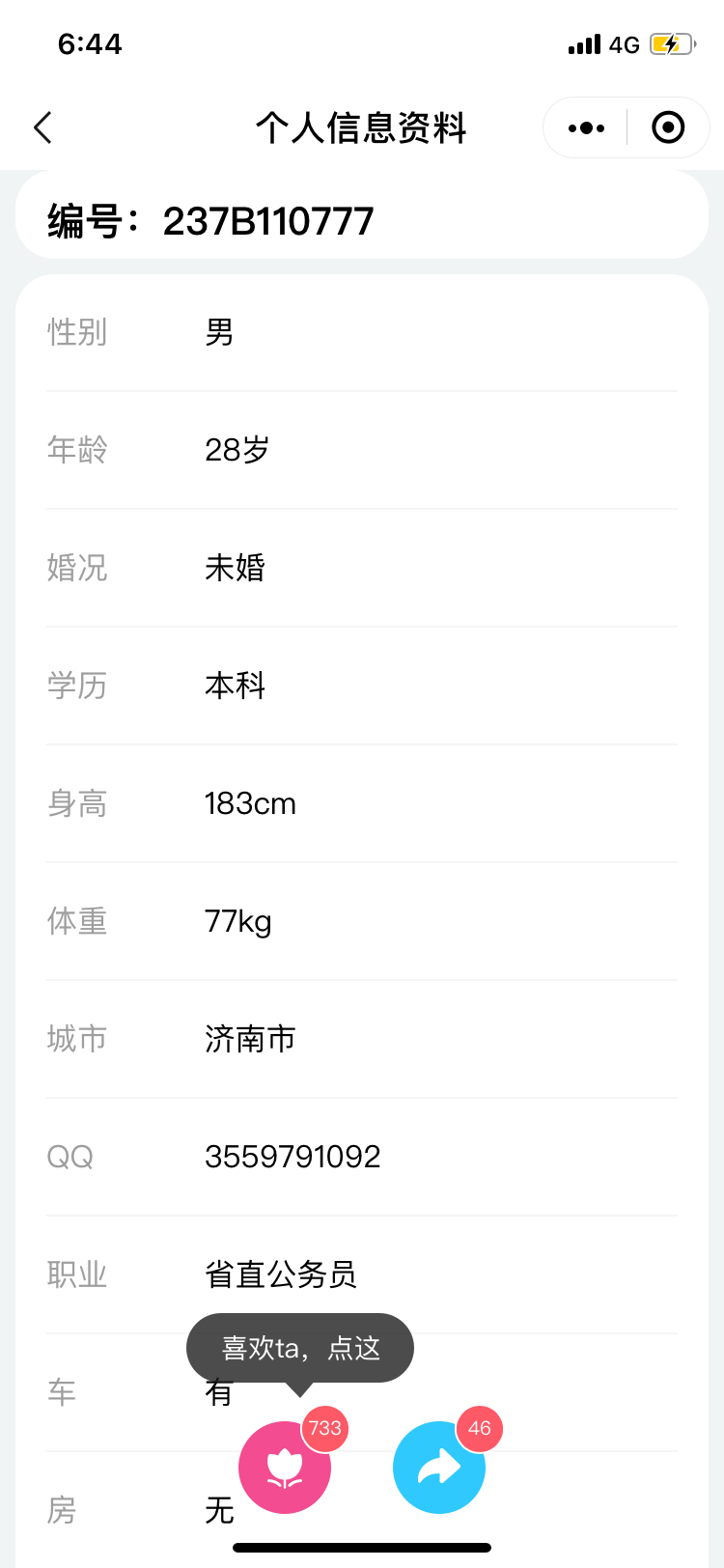 据了解,这位心动男生今年28岁,身高183cm,是一名省直机关公务员,这位男生是济南本地人,喜欢读书、打球、看电影,还喜欢摄影美食。热爱生活的他在个人简介中还写道,自己情绪稳定,懂得沟通不冷暴力,但是比较慢热。男生希望寻找一位本科及以上学历,年龄在24-30岁的姑娘,谈及未来的她,男生认为两人聊得来,相处舒服最重要。你会是他的心动女生吗?快来现场与他邂逅吧。