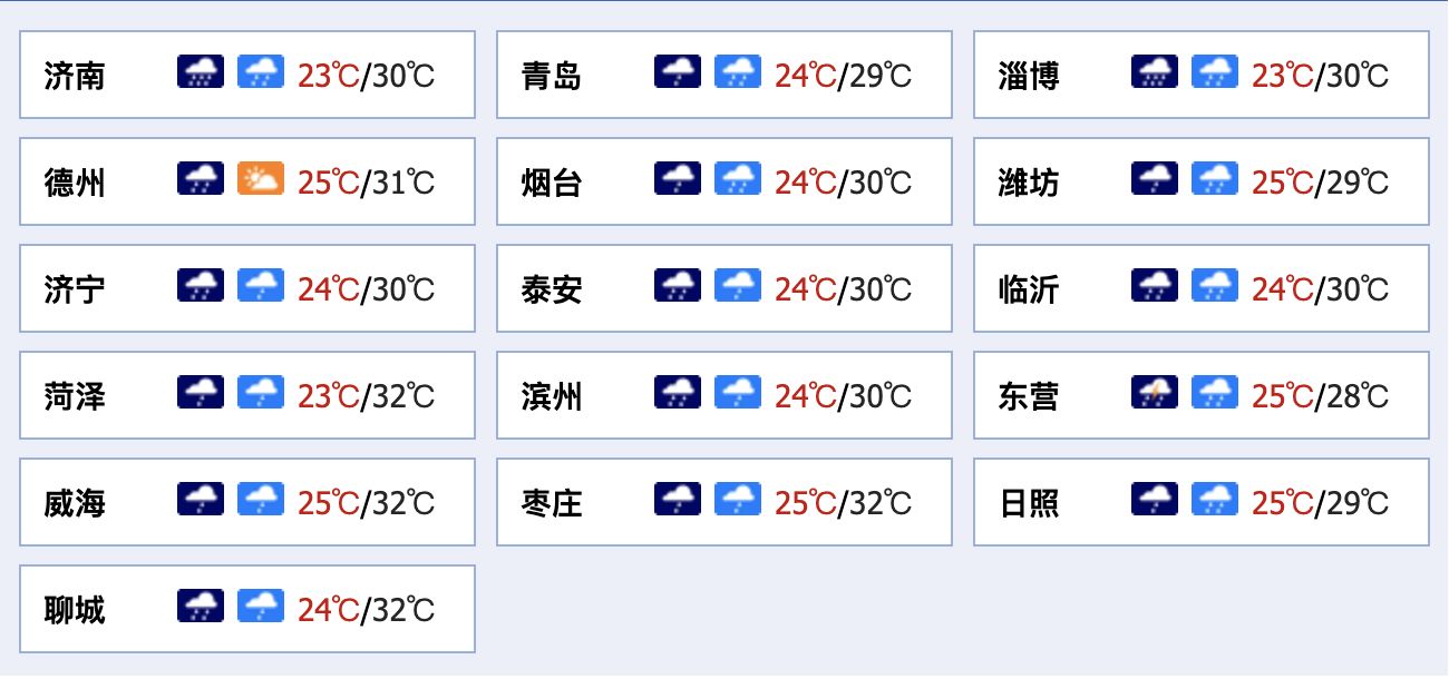最高气温:鲁中山区和沿海地区29℃左右,其他地区31℃左右。