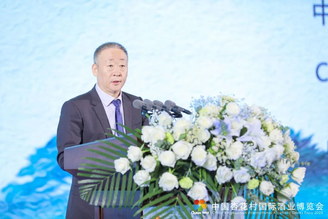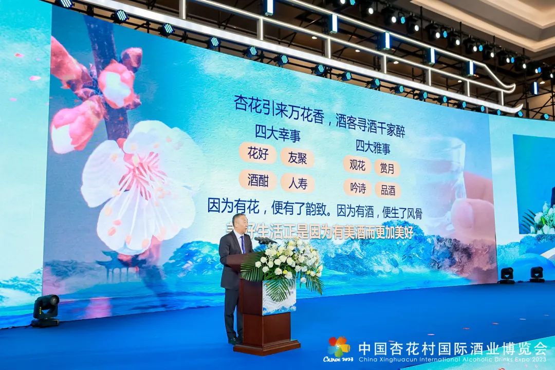 以下为致辞实录:花好、友聚、酒酣、人寿,是古人谓之的四大幸事;观花、赏月、吟诗、品酒,则是四大雅事。花前赏月酒有味,会人吟诗意无穷。花开时,品一壶好酒,赏一地芳菲;花落时,品一壶老酒,赏几许风情。因为有花,便有了韵致。因为有酒,便生了风骨。美好生活正是因为有美酒而更加美好。值此2023中国杏花村国际酒业博览会之际,我们在杏花酒香中相聚,自是别有一番风景。如果说国漫电影《长安三万里》热映,带火了唐诗和酒器。那么,千年前杜牧的《清明》牧童遥指杏花村,六千年前杏花村遗址的小口尖底酒瓮,则是杏花村美酒酿造的恒久见证。而自2017年起,杏花村酒业博览会历经五年精心打造,已经成为美酒文化,美酒经济、美酒科技、美酒消费、美酒品鉴、美酒旅游等多元性综合国际博览会,成为中国酒产业以酒文化为主题的重要国际展会。去年,酒博会由商务部批准提档升级为“中国杏花村国际酒业博览会”,提出了“五个一”发展目标:打造一个世界级清香型白酒产业集群;打造一个世界级清香型烈酒品牌;打造一个千亿产值的名酒产区;打造一个世界酒文化旅游胜地;打造世界美酒第一村——杏花村。今天,我们在此赏花品酒,共襄盛举,擘画吕梁汾阳杏花村酒经济蓝图,打造杏花村汾酒专业镇。看杏花繁茂,赏清香风姿;观酒城融合;览酒博盛况;品未来酒香。