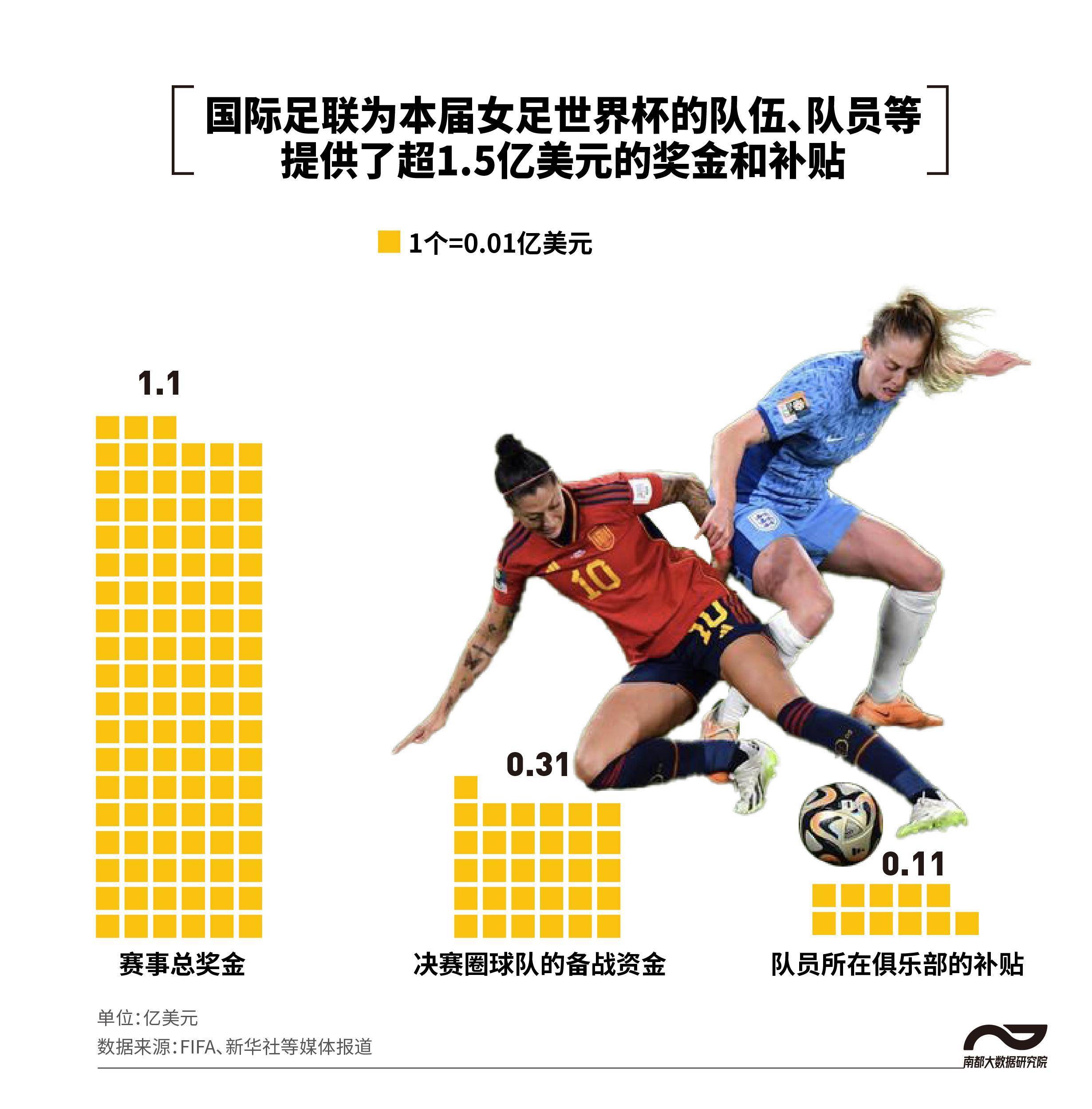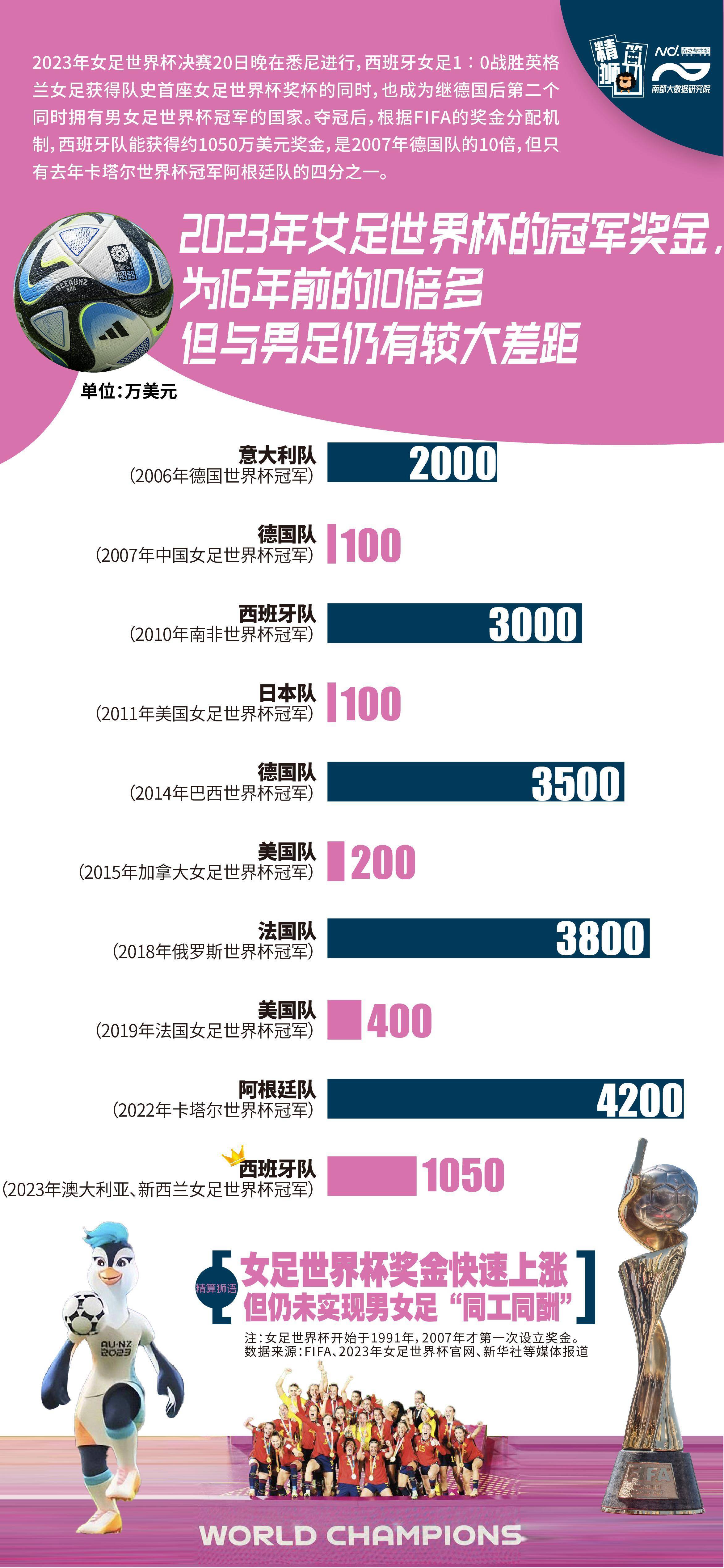 根据FIFA的奖金分配机制,西班牙队获得了1050万美元,这是什么概念?据南都大数据研究院统计,西班牙女足的夺冠奖金是2007年德国女足的10倍,为上一届美国女足的2.5倍,但只相当于去年卡塔尔世界杯冠军阿根廷队的四分之一。