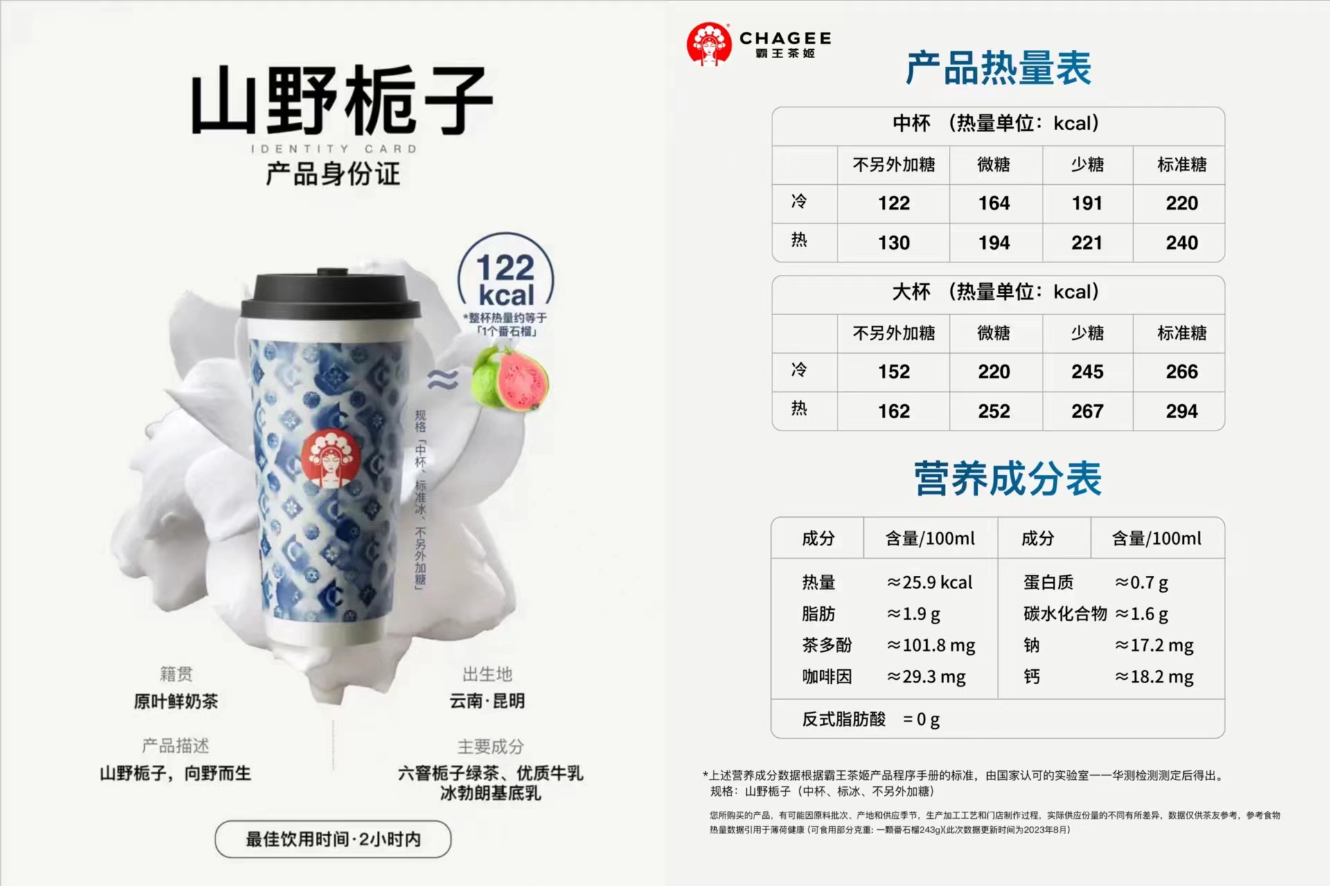 8月12日,霸王茶姬通过官方账号对外公布首批6款产品热量和营养成分,并同步在门店菜单、小程序、外卖等渠道上线“低负担控糖专区”,方便消费者一目了然地选择心仪饮品,实现了健康可视化、信息透明化。目前,首批拥有这张“专属身份证”的产品分别为伯牙绝弦、寻香山茶、花田乌龙、桂馥兰香、青沫观音、去云南·玫瑰普洱。
