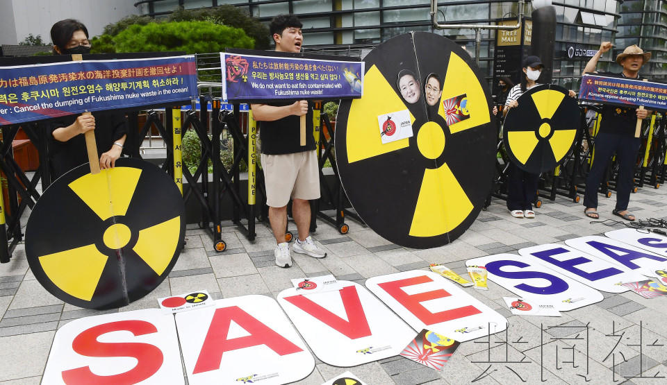参加集会的市民手中高举“誓死反对(核污染水)排海”“大海不是日本的核垃圾场”“谴责杀死海洋的日本政府”等标语,面向日本驻韩国大使馆齐声高呼“(韩国)国民愤怒不安,立即撤回核污染水排海决定”等口号。