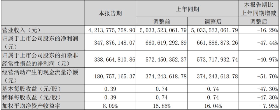 报告期内,公司实现营业收入4,213,775,758.90元,同比减少16.29%;归属于上市公司股东的净利润347,876,148.07元,同比减少47.34%。