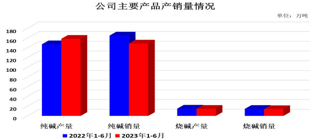 此外,在报告期内,山东海化继续致力于纯碱、烧碱、溴素、氯化钙、小苏打等产品的生产和销售。从公司主要产品产销量情况来看,纯碱为公司主导产品。其中,纯碱产量158.49万吨,销量148.86万吨;烧碱(折百)产 量14.50万吨,销量13.73万吨。