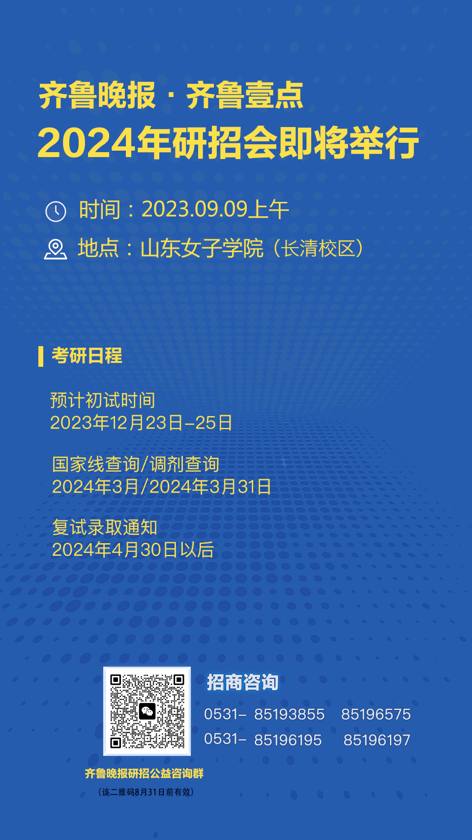 近期,关于2024年硕士研究生招生考试的新变化陆续而来,怎么理解这些新变化?2024年硕士研究生报名怎么报?各高校研究生招生政策有什么变化?未来研究生的培养会有什么新的趋势?9月9日上午,齐鲁晚报·齐鲁壹点2024年研究生招生咨询会将在山东女子学院举行,正在紧张准备考研的考生们可以与各高校的研究生招生负责人现场交流。