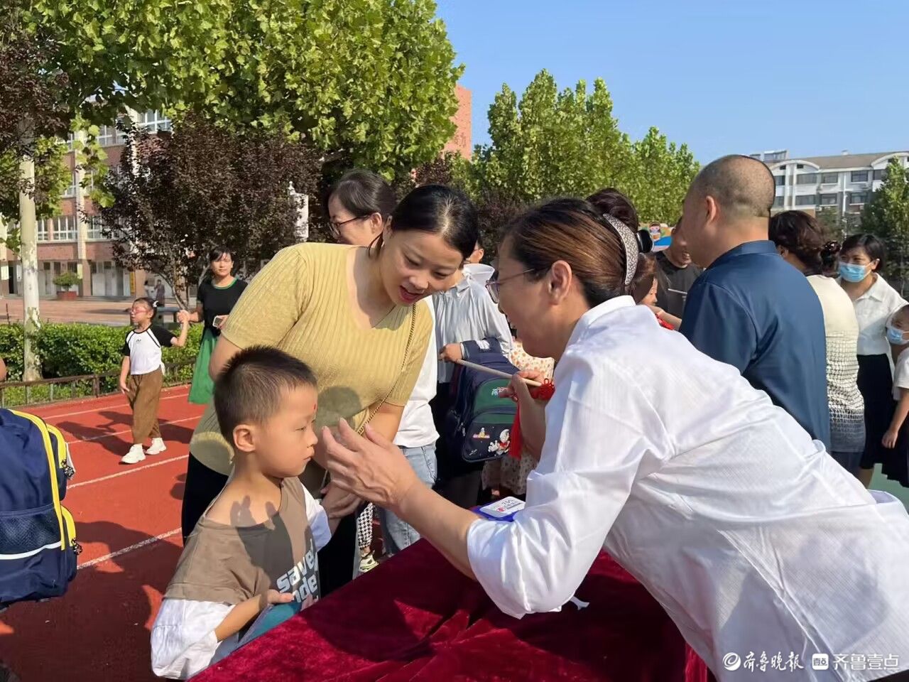 一年级小朋友怀揣着对新校园的憧憬,在家长的陪同下,他们迈过启智门,跨过“成长祝福栏”接受着教师们的美好祝愿。校领导和一年级班主任为一年级学生点上朱砂,送上真挚的期许和祝福。此外还精心准备了“相约成长树”“拍照打卡”等活动。