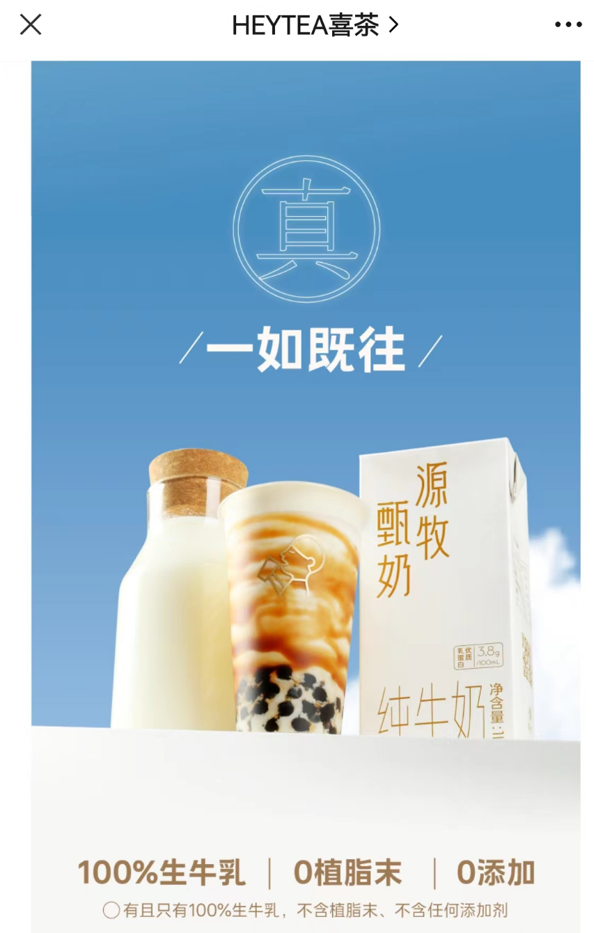 9月4日,喜茶官宣推出行业首款新茶饮专用真牛乳——3.8源牧甄奶。该牛奶富含3.8g/100mL优质乳蛋白,且以100%生牛乳为原料,不含植脂末和任何添加剂。喜茶表示这是新茶饮品牌跨界乳品行业做牛奶的一次全新尝试。