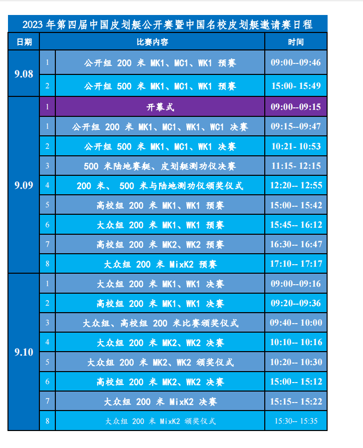 本次比赛涵盖公开组、大众组和高校组三个不同组别,设有男、女子单人皮艇竞速赛,男、女子单人划艇竞速赛,皮划艇单、双人竞速赛,测功仪比赛等项目,8日将进行公开组项目的预赛。本次赛事具体赛程如下:
