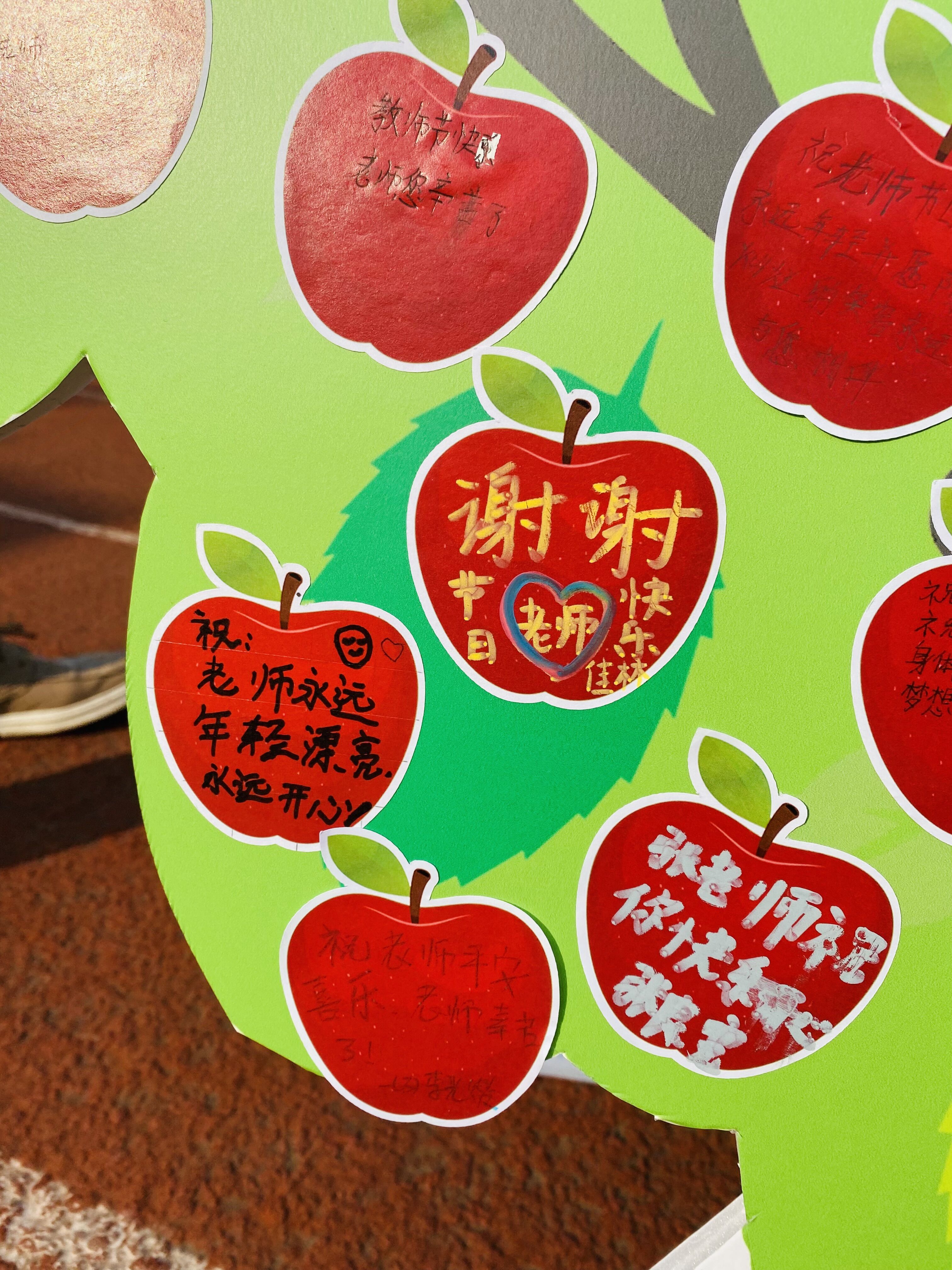 原来学校为了庆祝第39个教师节,让孩子学会、懂得感恩组织的一次活动。一枚枚苹果上有的写着:您是我的引路人,感谢您的教导,祝您节日快乐;有的写着:老师您是辛勤的园丁,祝您桃李芬芳……而老师们则将最美好的祝福送给了学生。这棵“成长树”在教师节来临之际寓意深刻,不仅饱含着全校老师对学生茁壮成长的祝愿,更是全体教师践行教学相长的誓言。