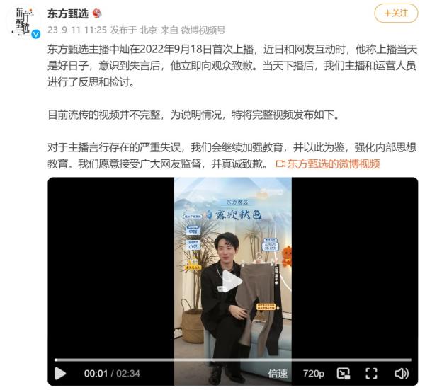 东方甄选公布涉918言论完整视频,称主播严重失误将加强教育