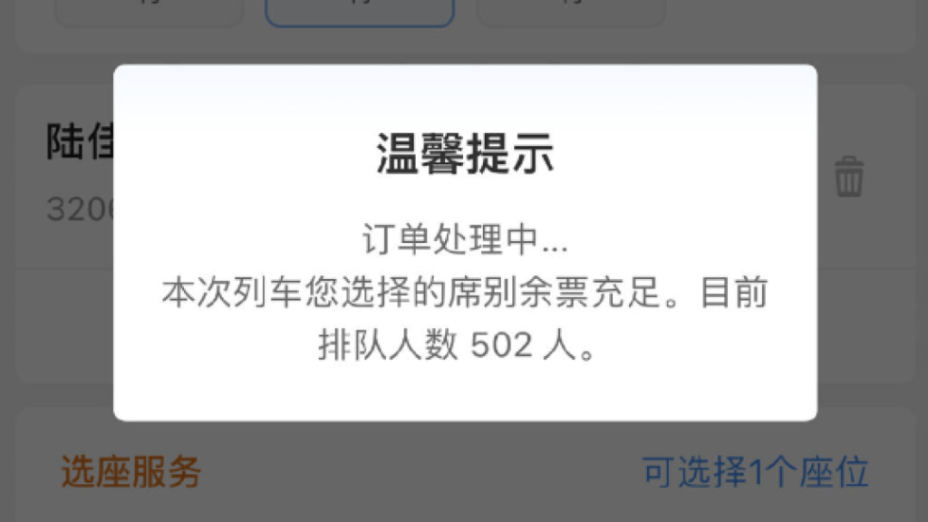 @樱桃脂仔:我的后台是有乘车人信息的。结果显示系统繁忙,刷新了3次,才刷出来,然后票也没了,就几秒的时间,我一早上就开始盯着了,其他的甚至还有20张票的,我点进去都说没了?
