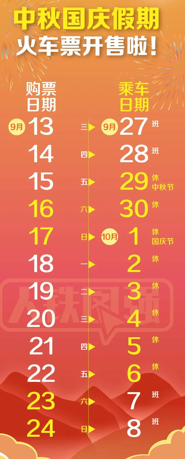 据中国国家铁路集团有限公司(以下简称“国铁集团”)消息:今年铁路国庆黄金周运输自9月27日开始,至10月8日结束,为期12天。9月13日,铁路12306发售国庆黄金周运输第一天的火车票。