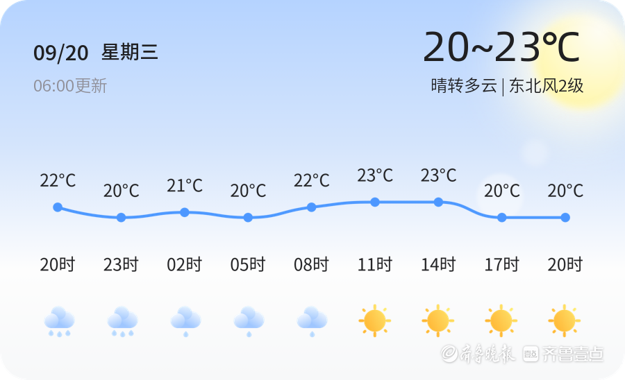 晴转多云,温度 20~23℃,东北风2级。未来三天最高温度26℃,最低温度13℃。主要以晴天为主,可能会有下雨天,请密切关注天气变化。