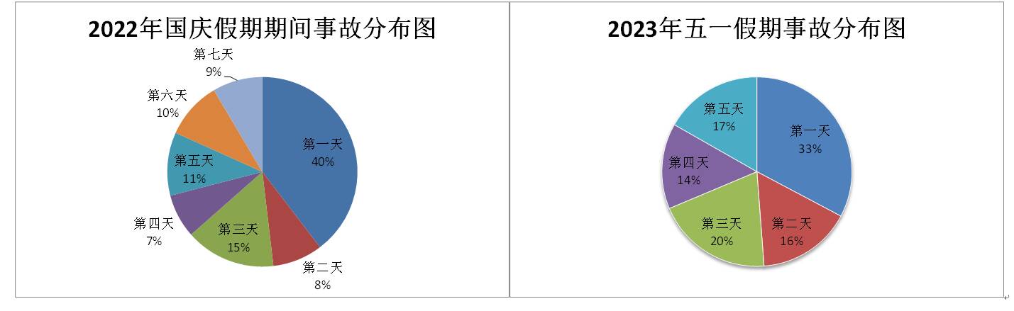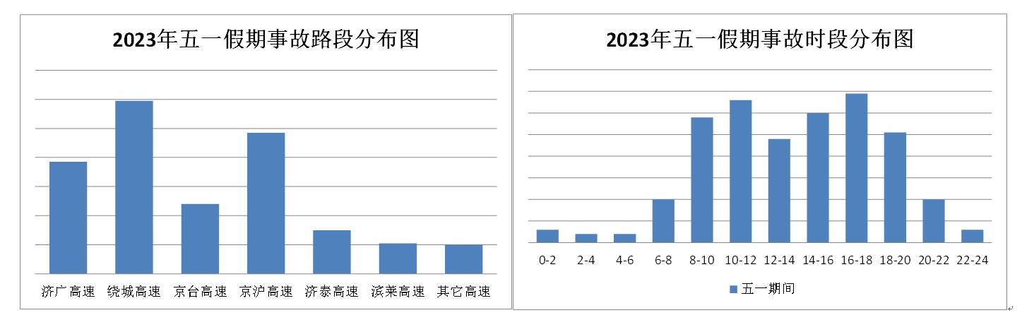 根据近三年国庆假期以及今年五一期间交通事故数据统计,高速公路交通事故多发时段为8时至12时, 6时至8时以及14时至20时故事较日常也有所增长;交通事故多发路段主要集中在济广高速上,占交通事故总起数的44.30%,今年济广高速受改扩建施工影响,仍须重点关注。绕城高速和京沪高速,分别占事故总起数的18.63%和15.19%,预计今年事故占比会有所上升。预计2023年中秋国庆假期高速公路交通事故多发路段为济广高速,绕城高速、京沪高速。