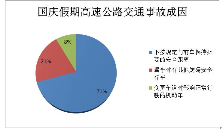 通过对以往假期高速公路交通事故成因分析,不按规定与前车保持必要的安全距离所引发的道路交通事故占71%,驾车时有其他妨碍安全行车占21%,变更车道时影响正常行驶的机动车占8%。通过数据统计,假期高速通行的小型车辆占比在90%左右。由此可见:小型轿车的追尾事故在高速公路道路交通事故起数占比较大,需要重点关注。